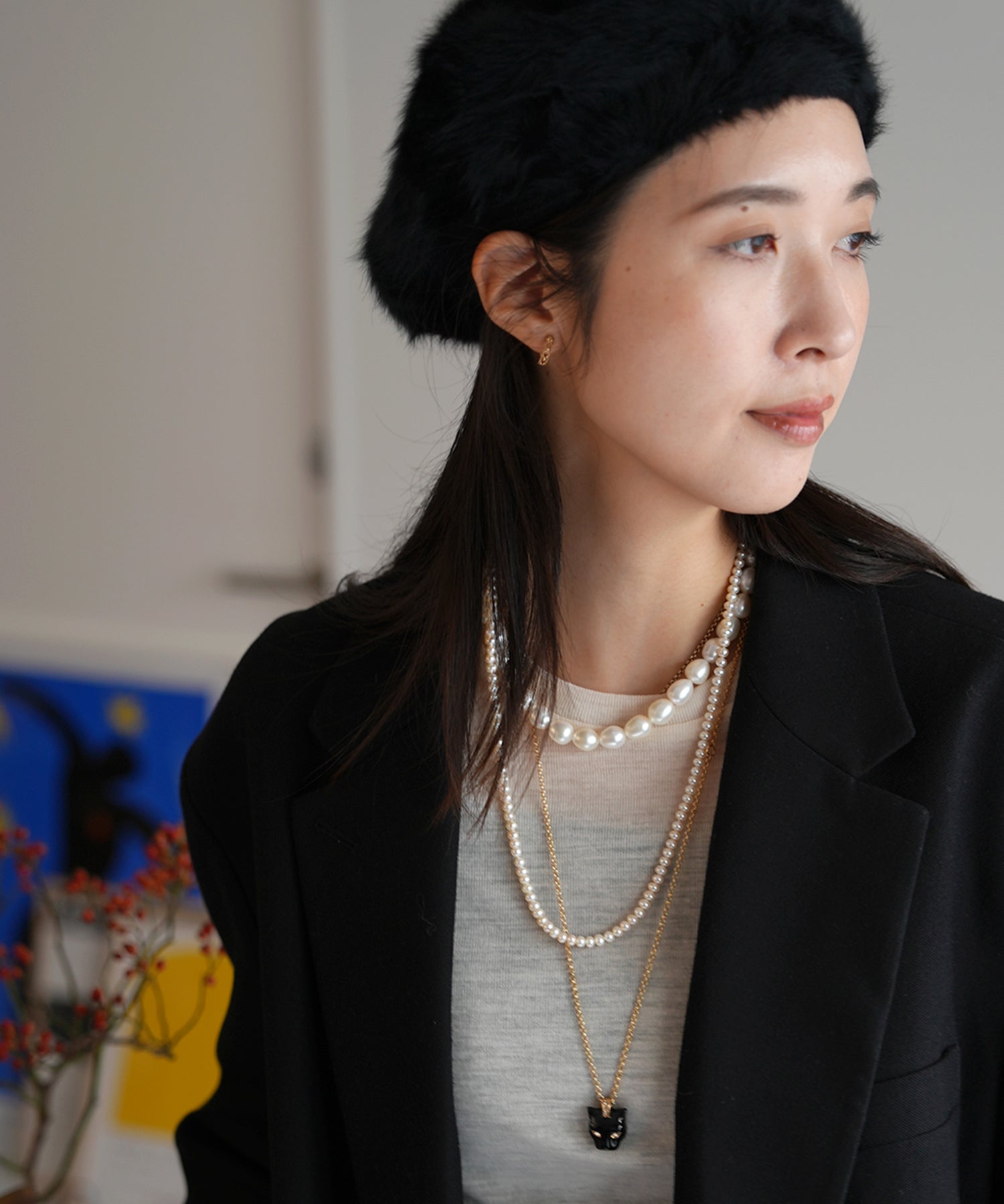 深みのあるブラックと、顔まわりを明るく見せるベージュの2色展開。秋冬のコーディネートに上品な立体感とあたたかみを添えてくれます。