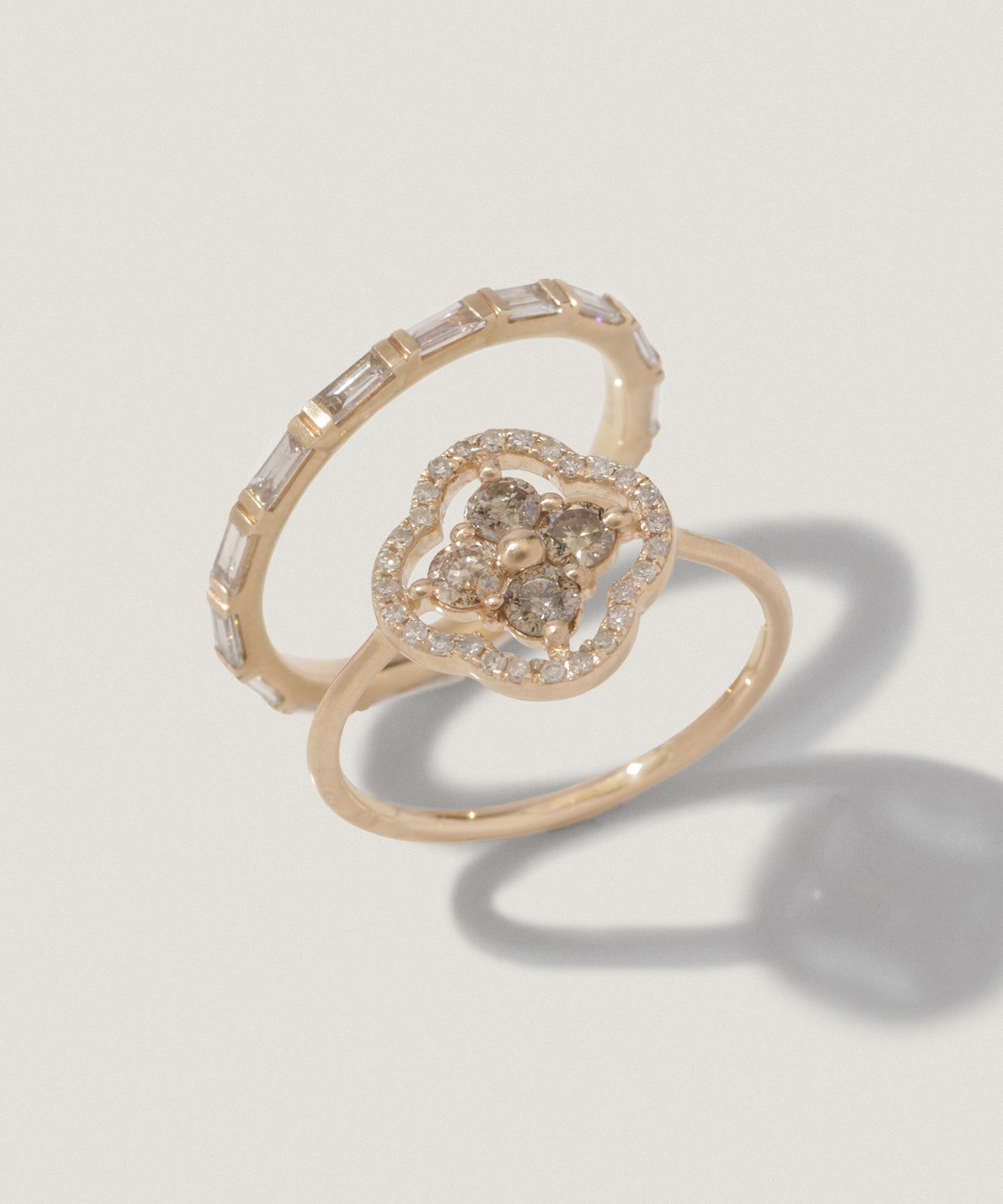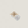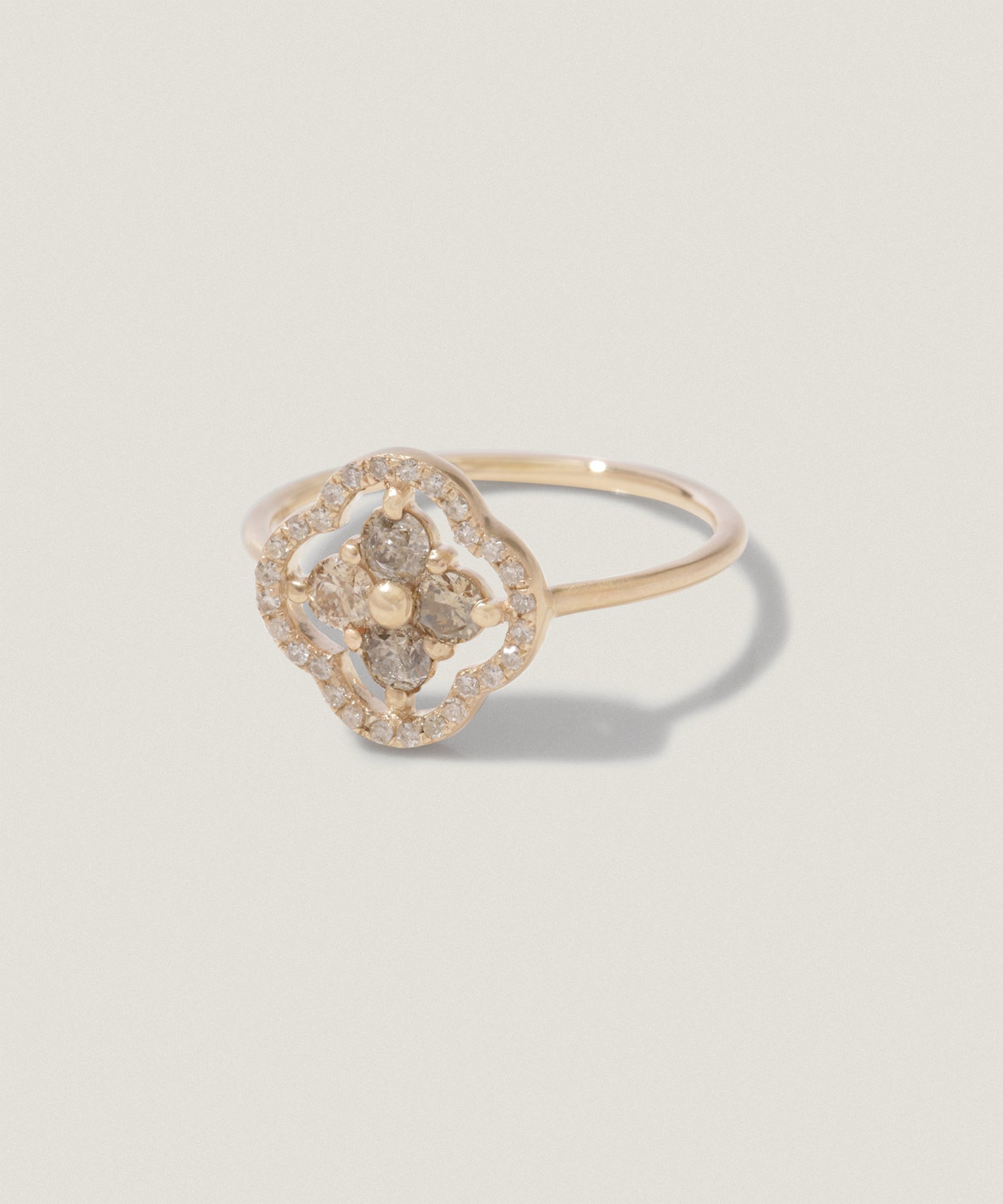 中心にはブラウンダイヤを、周囲にはクリアなホワイトダイヤを配した、表情豊かなコンビネーションです。