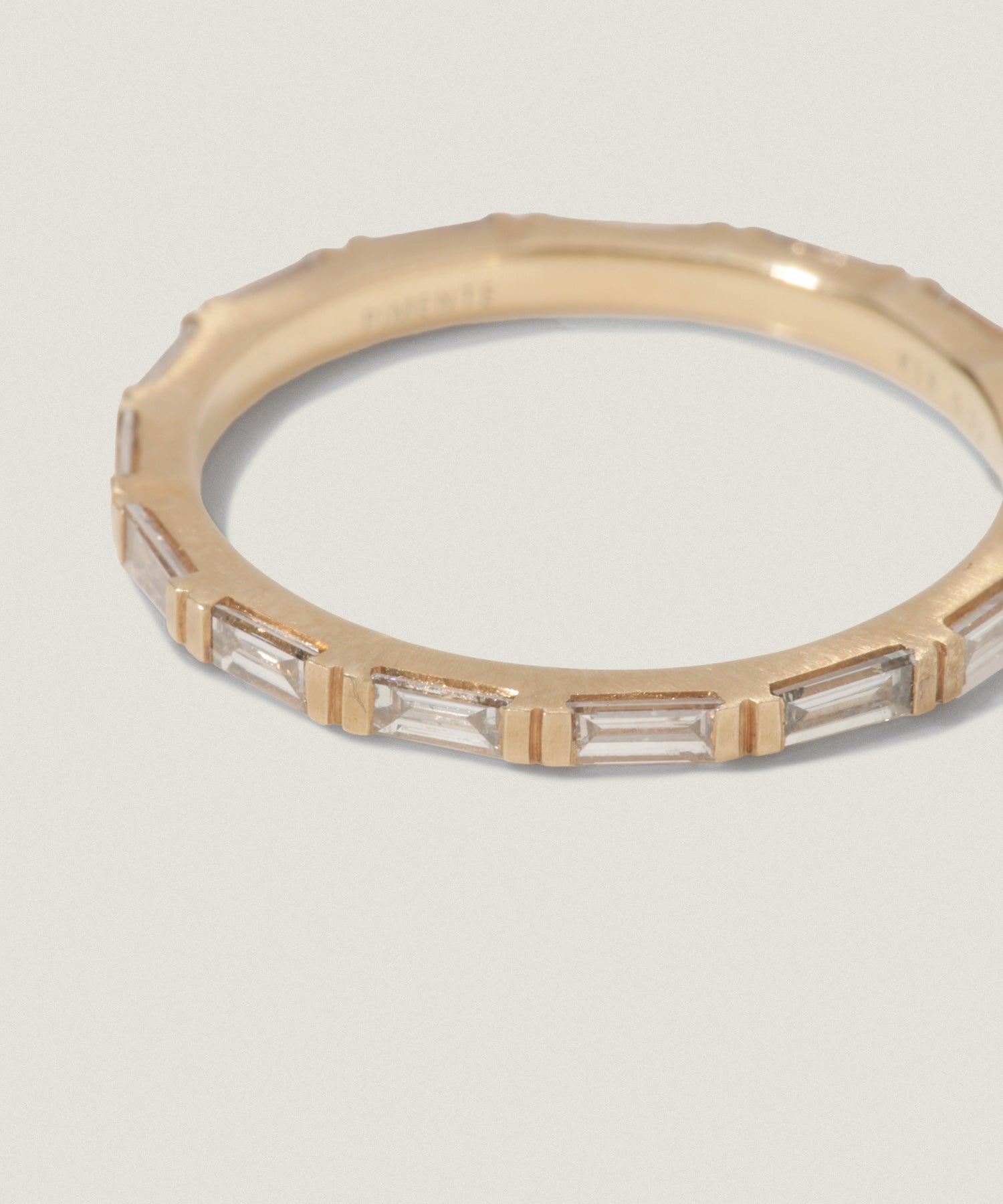 まっすぐにカットされたバゲットダイヤを、贅沢に横一列に並べたエタニティタイプのリング。
