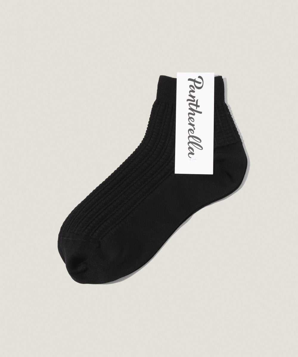 英国ブランド「Pantherella(パンセレラ)」のショート丈ソックスは、クラシックな透かし編みデザインが特徴。