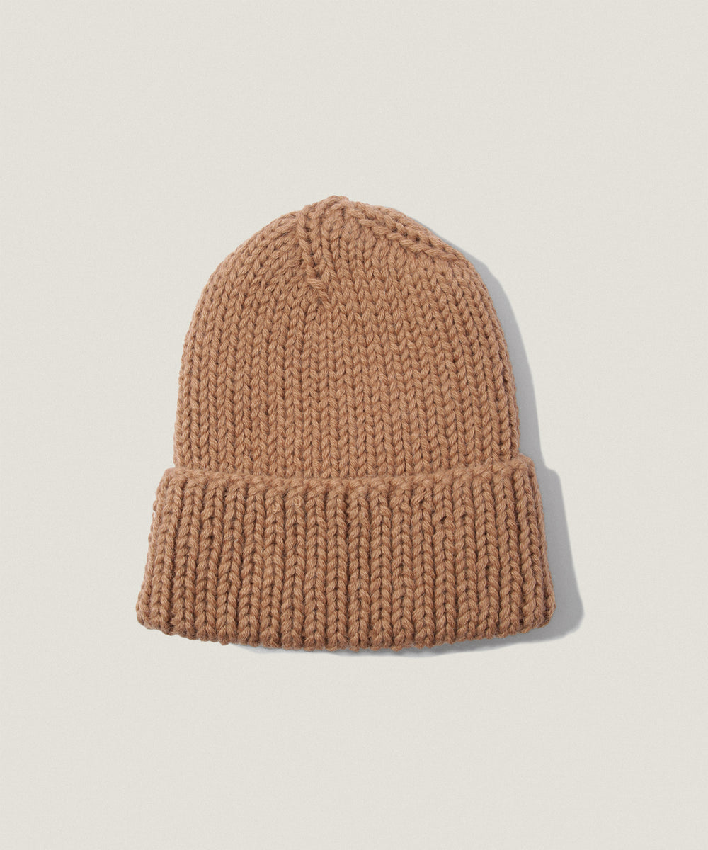 このビーニーは、柔らかさと、手編み特有の揺らぎがあるからこそ、ラフにかぶってもサマになります。