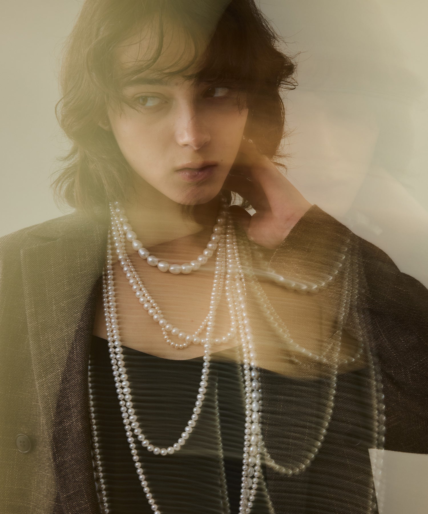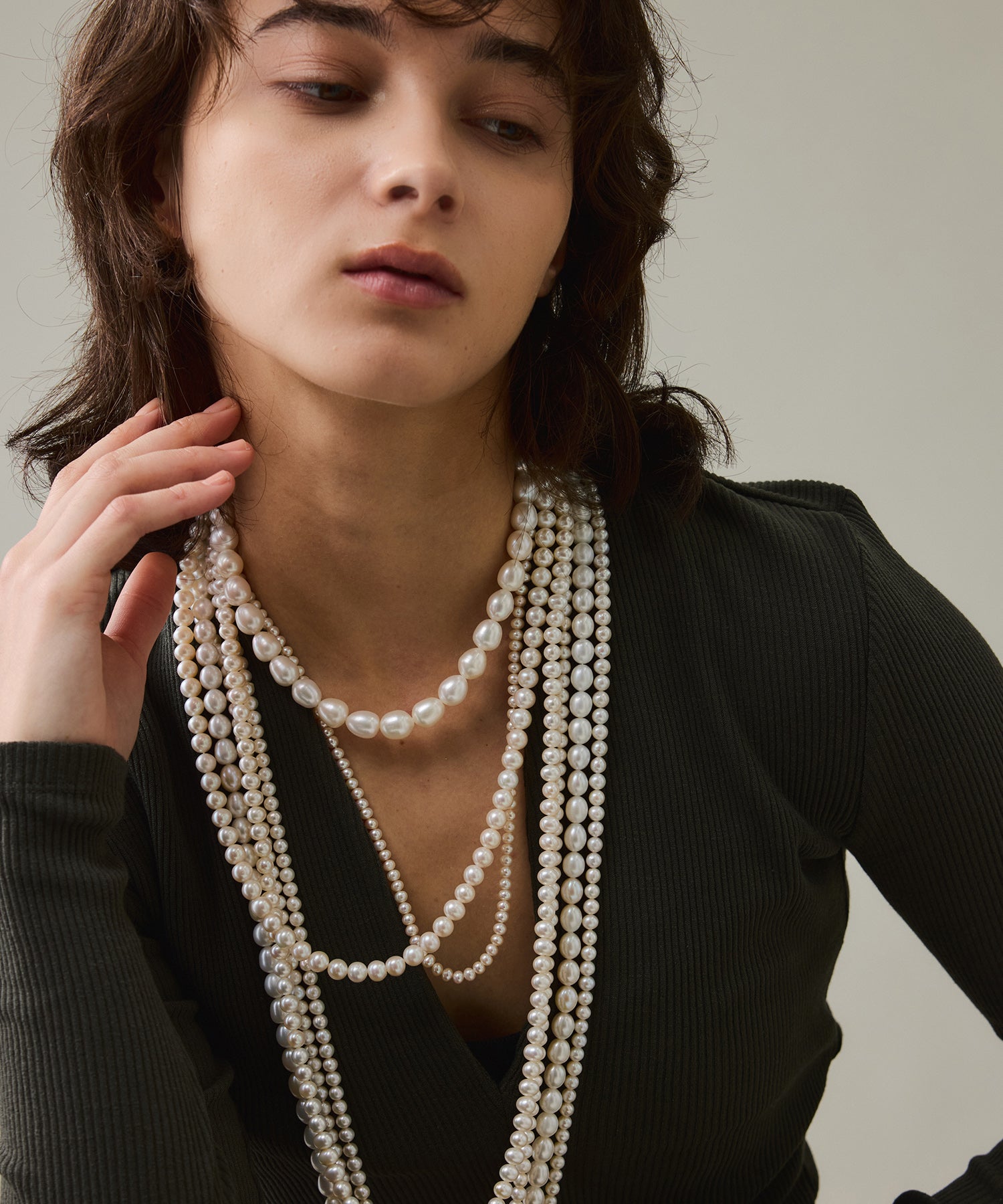 ニットの上からも、タートルの首元にも、自在にレイヤードが楽しめるように、粒のサイズと長さにバリエーションを持たせたパールネックレスを揃えました。