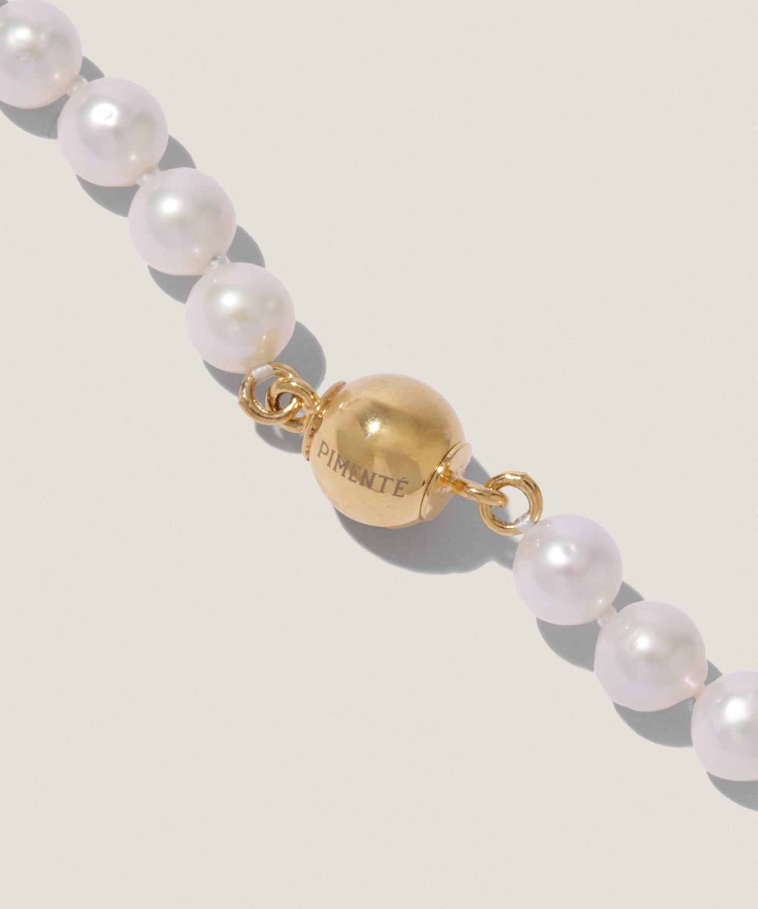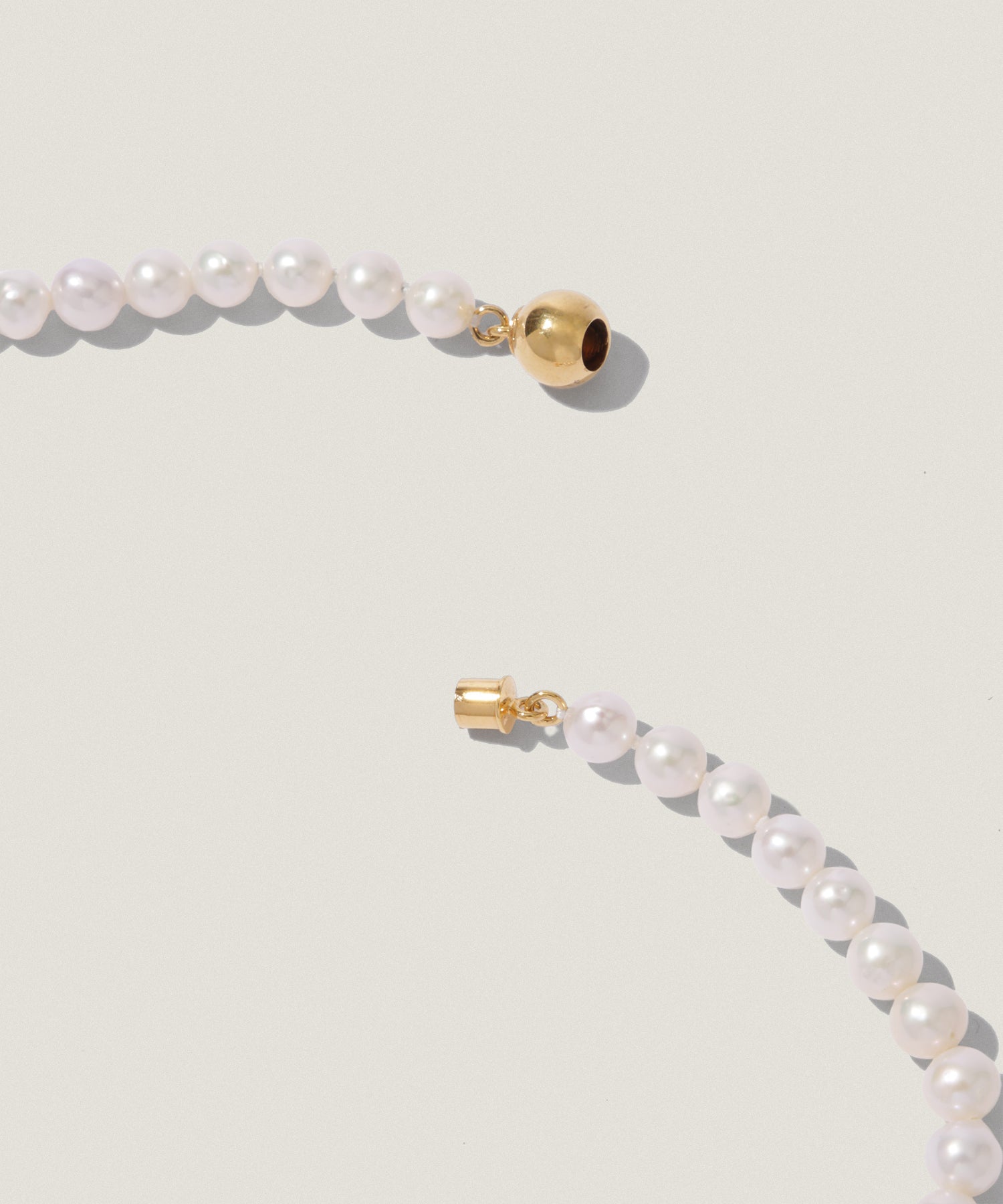 淡水パールの中でも比較的均一な大きさと光沢を持つ高品質な珠を選定し、ややしっかりめのボリュームで首元に華やぎを添えます。