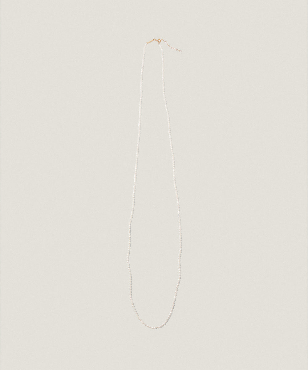 繊細で細長い形状が特徴のライス型淡水パールを使用した、80cmのロングネックレス。
