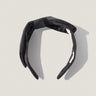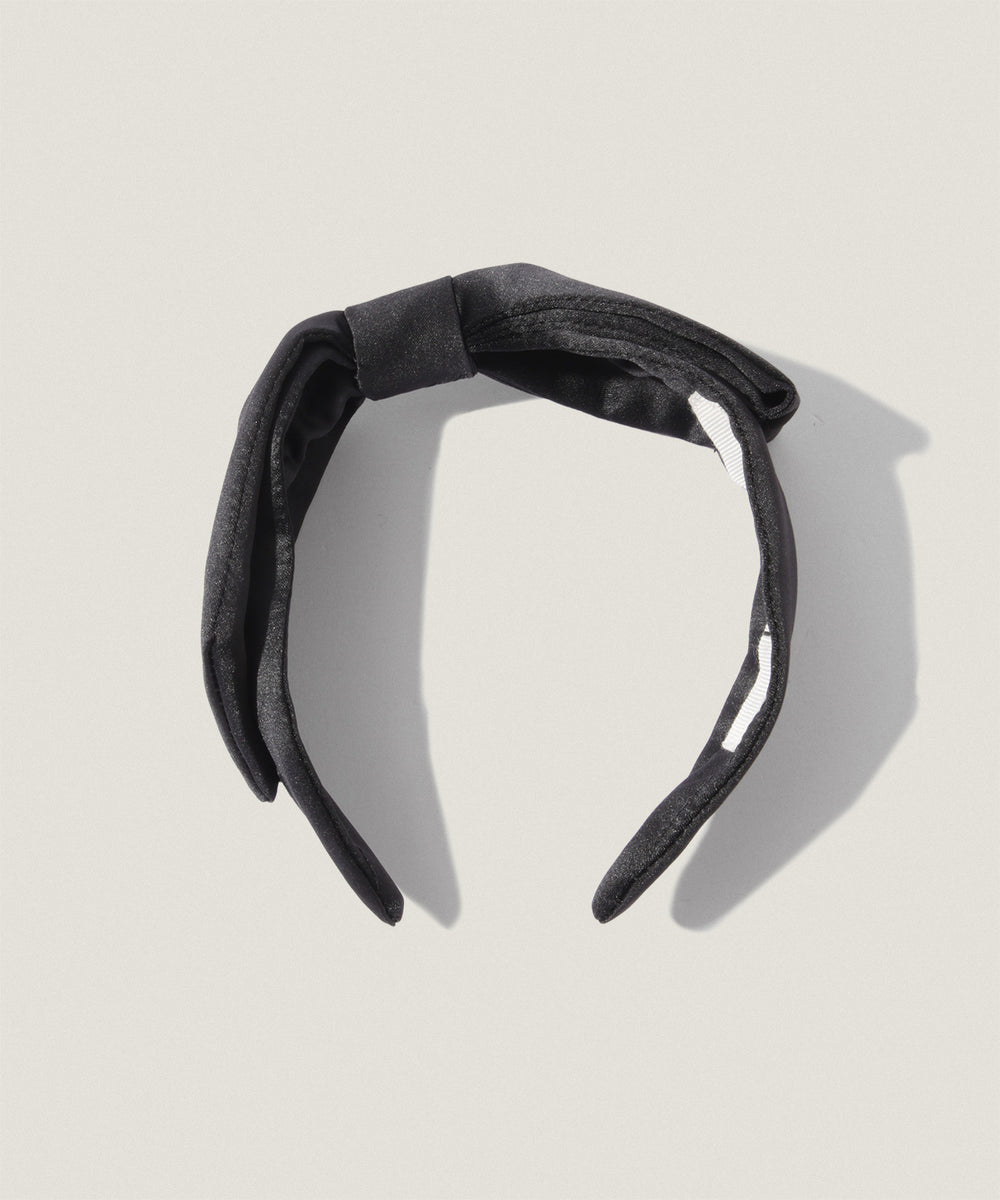 光沢のあるブラックサテンで仕立てた、ノットリボンデザインのカチューシャ。
