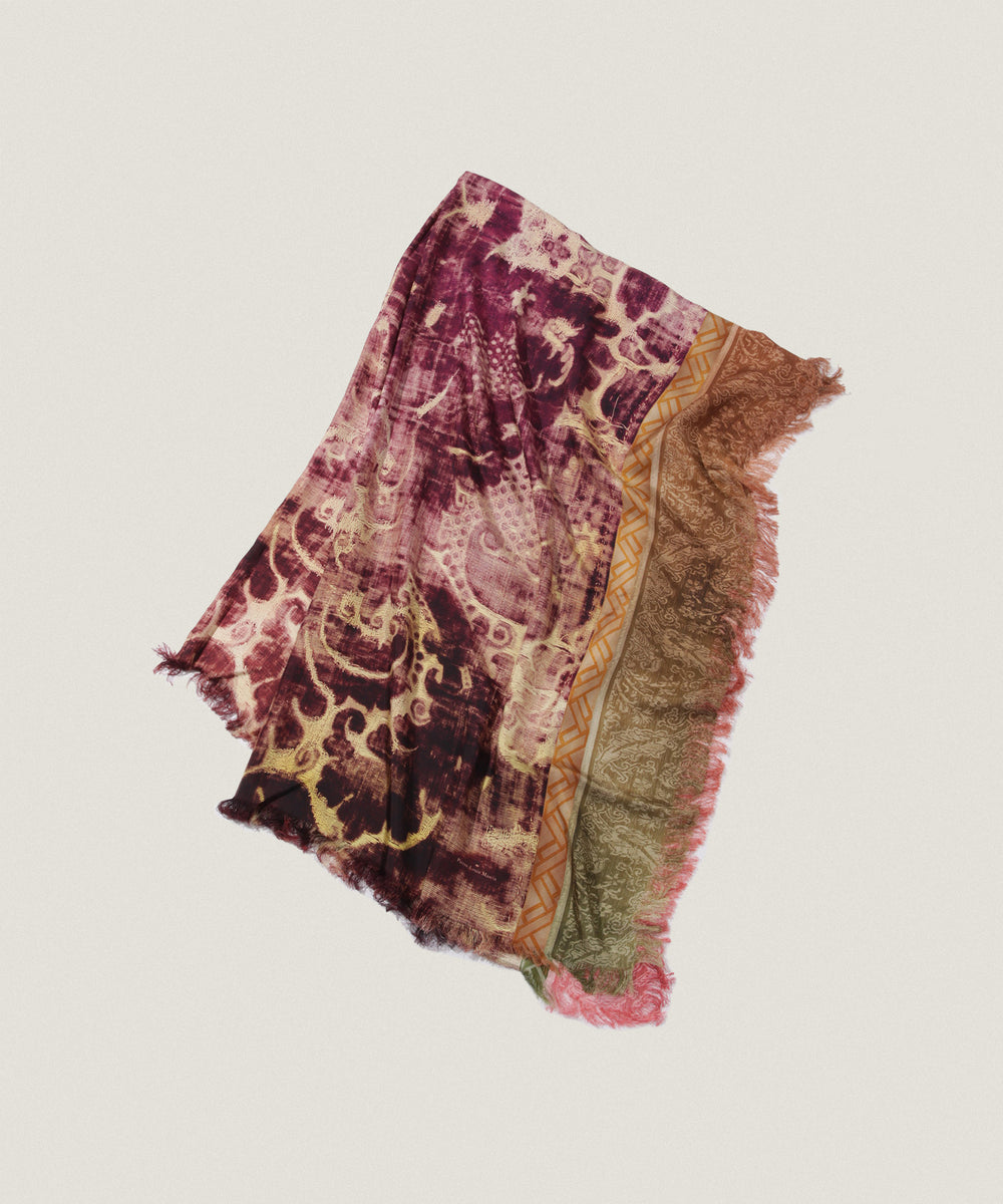 深いワインレッドとグリーンが交差するダマスク模様は、クラシックでありながらモダン。奥行きある色調が装いに気品を添えます。