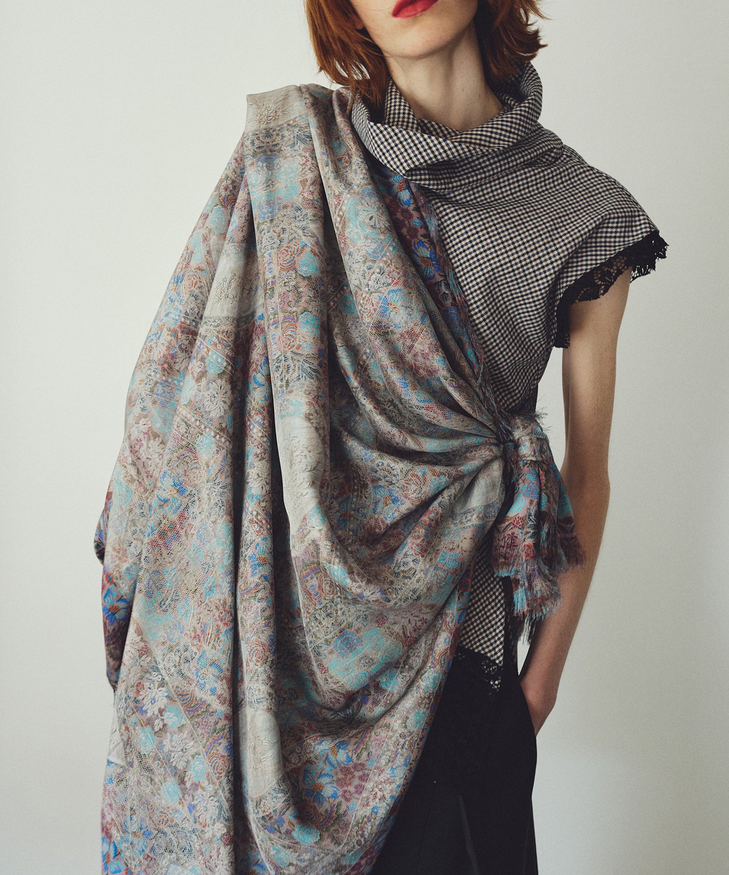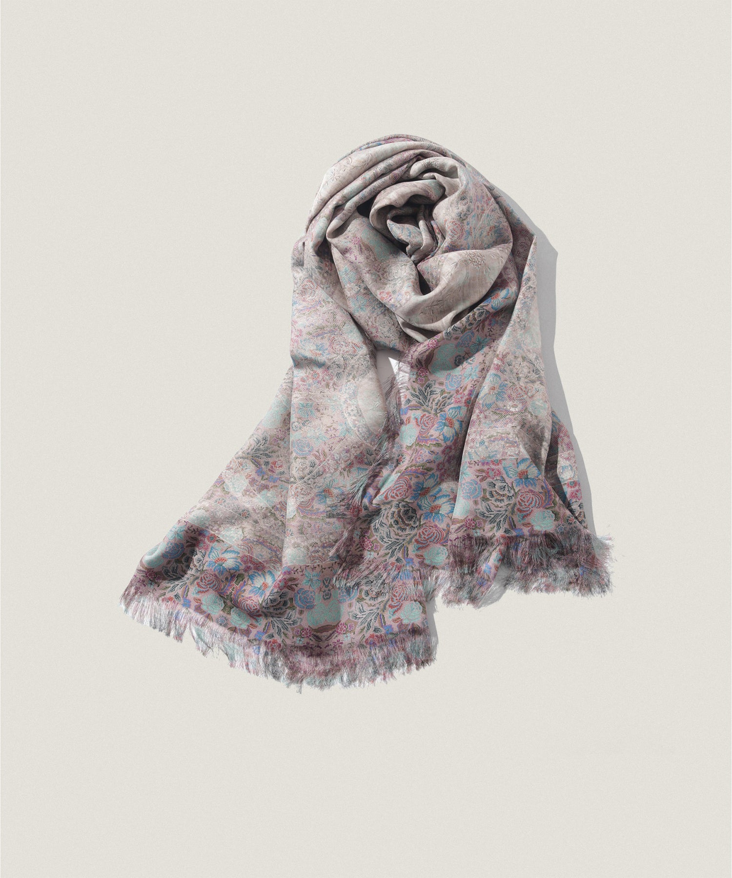 プリントスカーフの名産地として知られるイタリア北部・コモ湖周辺で生産され、長い歴史を持つテキスタイル技術と、詩的な感性が融合した一枚です。