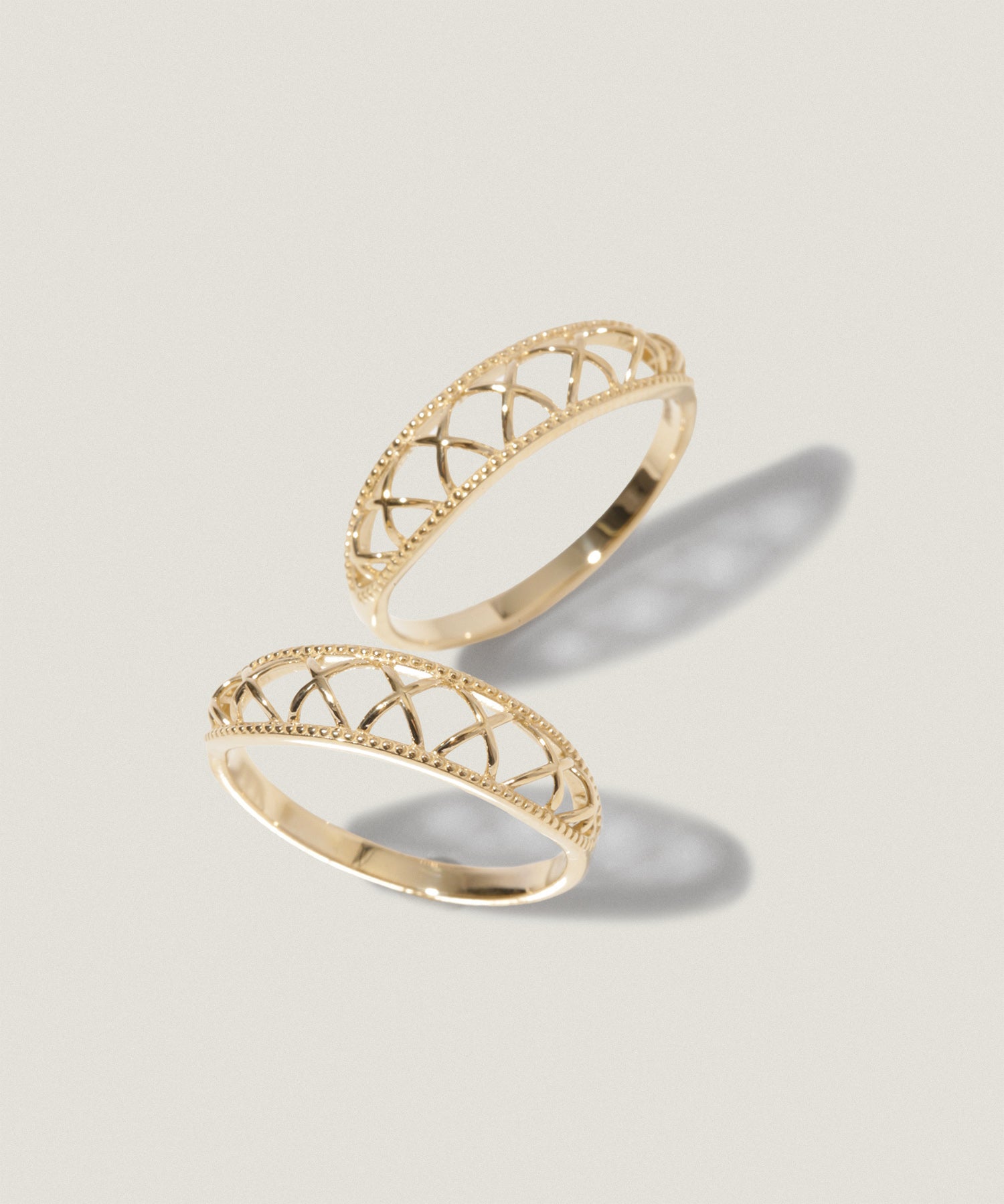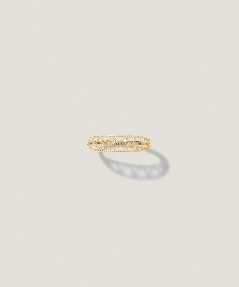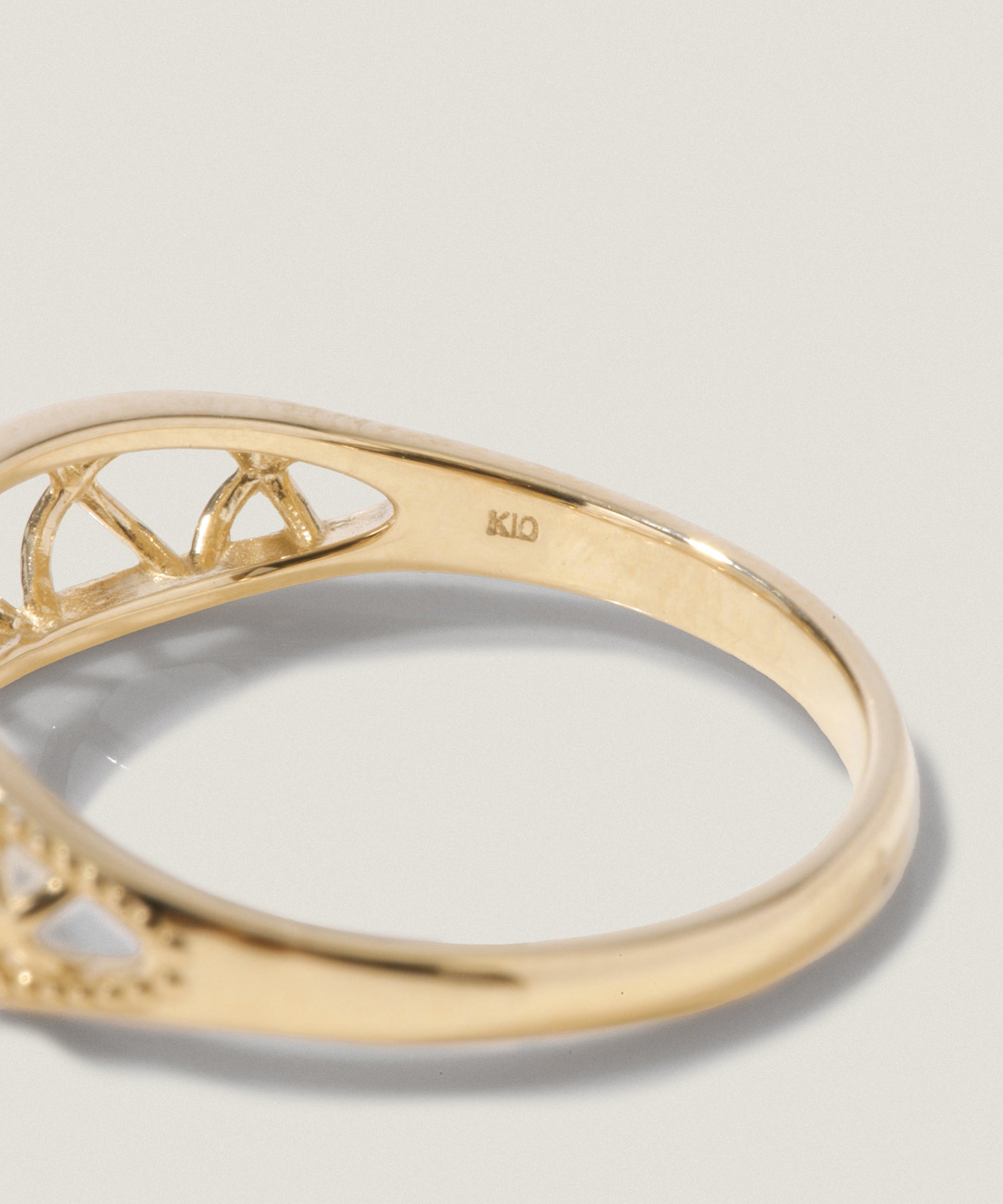 繊細な透かし模様と、ミル打ちのディテールが際立つK10ゴールドの華奢リング。