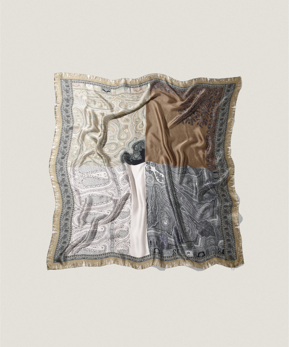 プリントスカーフの名産地として知られるイタリア北部・コモ湖周辺で生産され、長い歴史を持つテキスタイル技術と、詩的な感性が融合した一枚です。