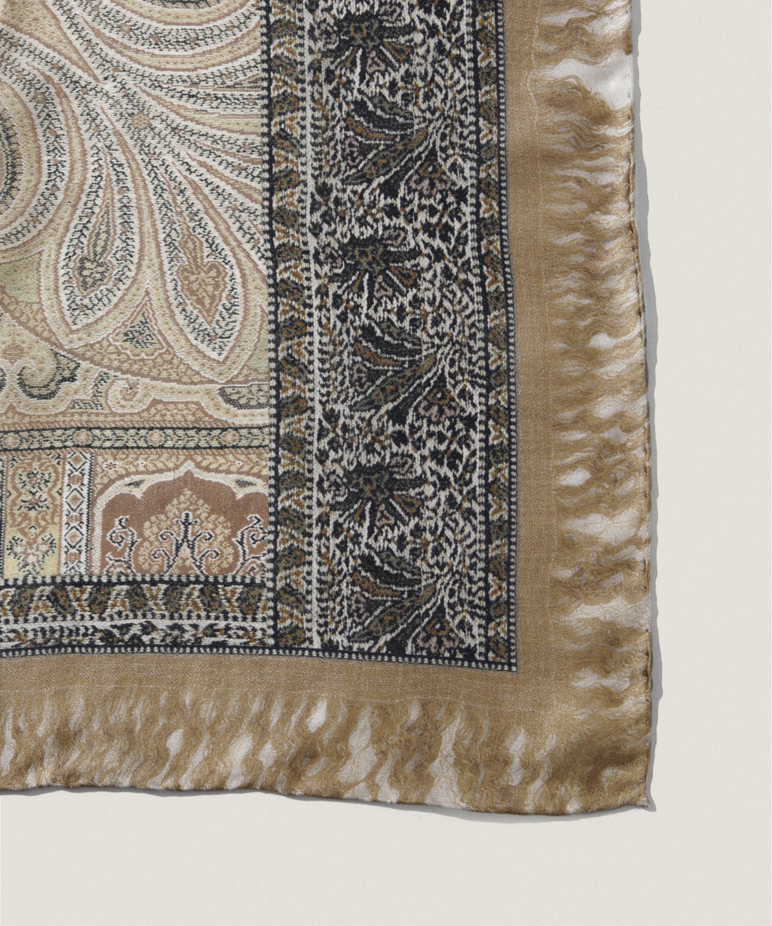 マシアならではの柄の美しさは言うまでもありませんが、フリンジが描かれているので、フリンジのスカーフを使いたいけど、敏感肌で気になる、という方にもトライして頂けます。大判で、4つに分かれた柄が見える面で印象が変わるので、実はとってもお得な1枚です。