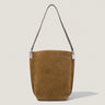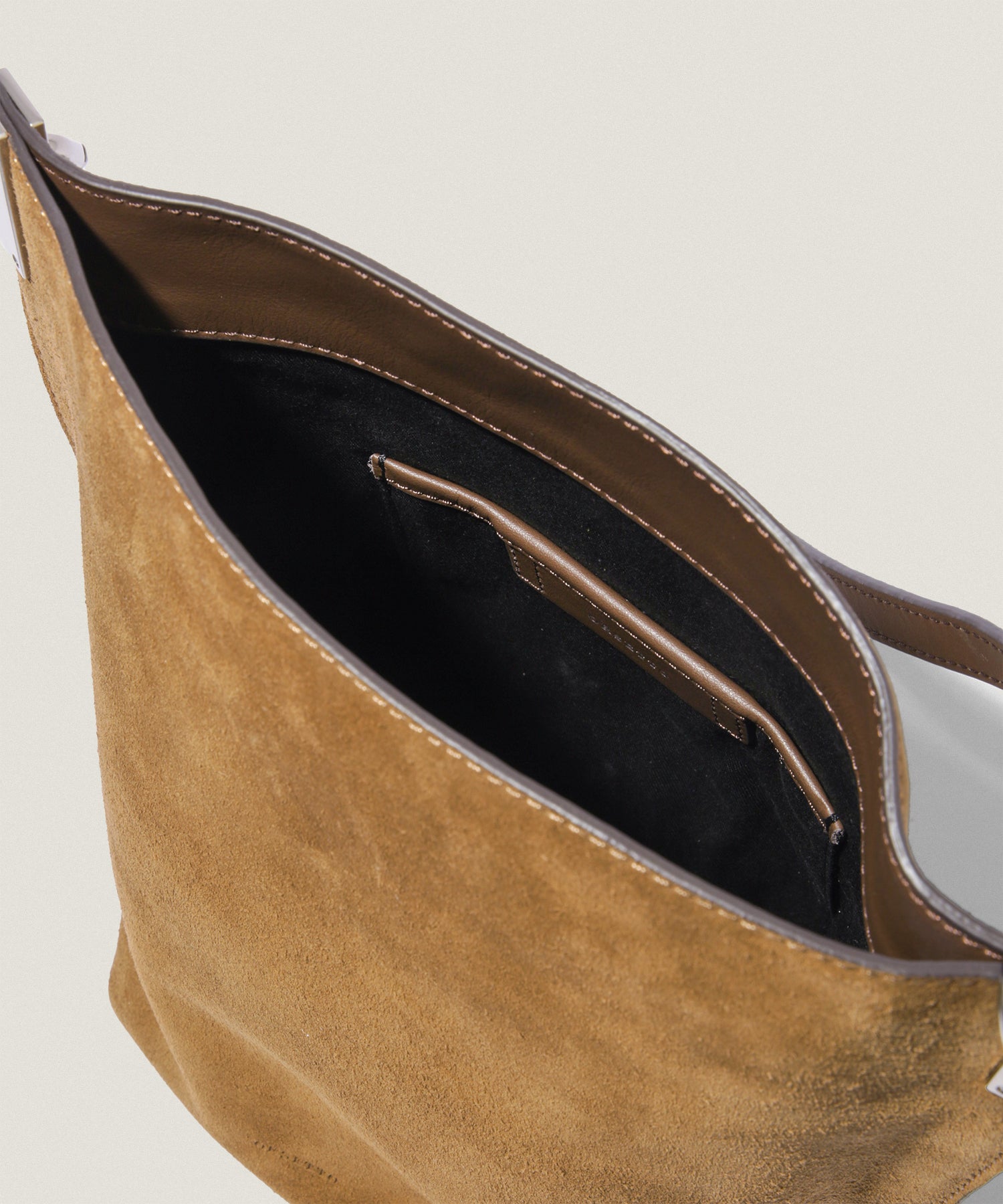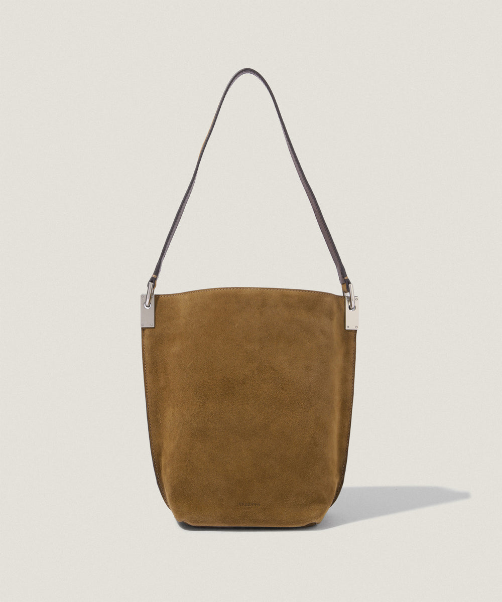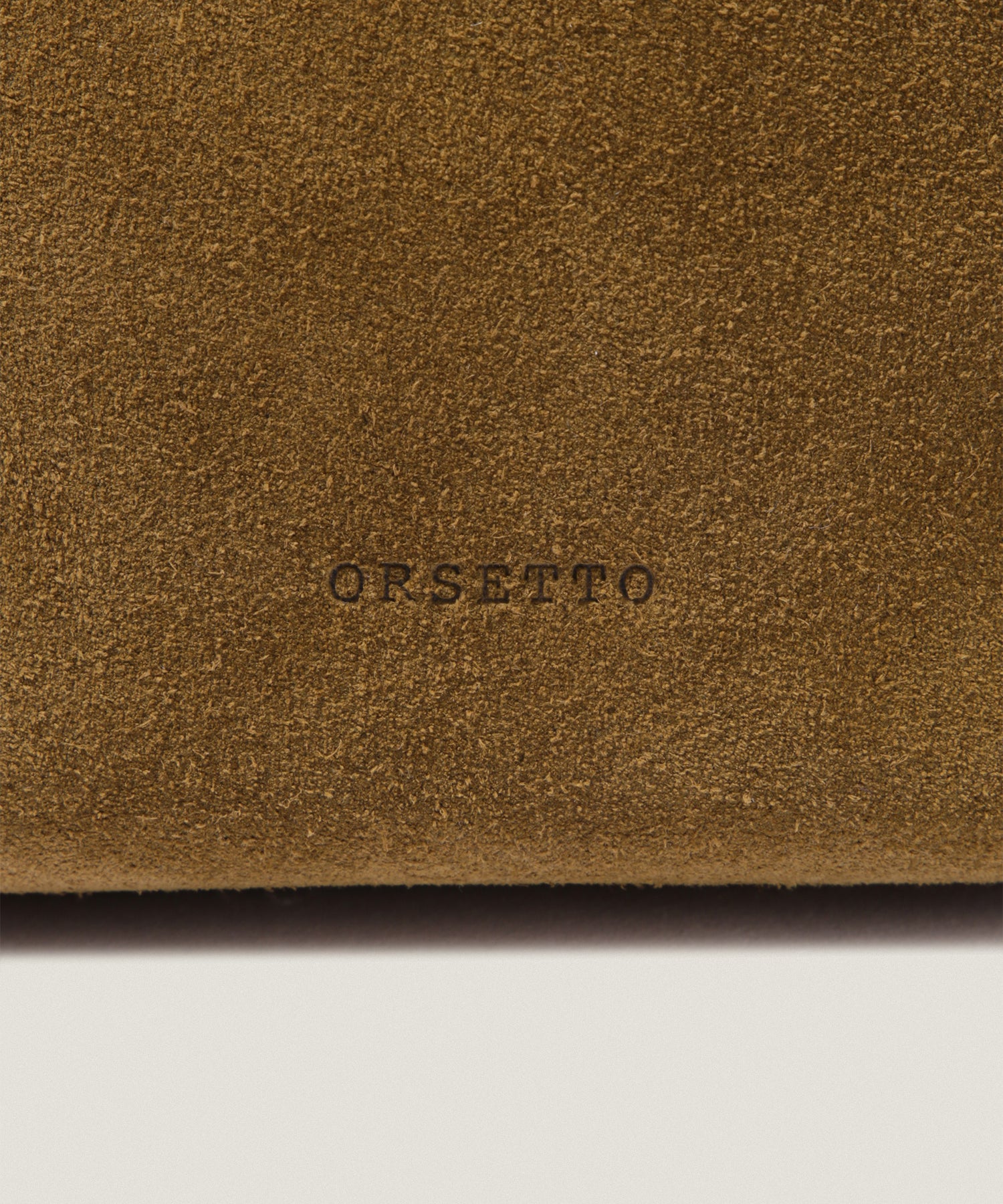 ORSETTO(オルセット)らしい端正なフォルムはそのままに、素材と色のコントラストで新鮮な印象に仕上げたカーキ(カラー名:ブラウン)のバケットバッグ。