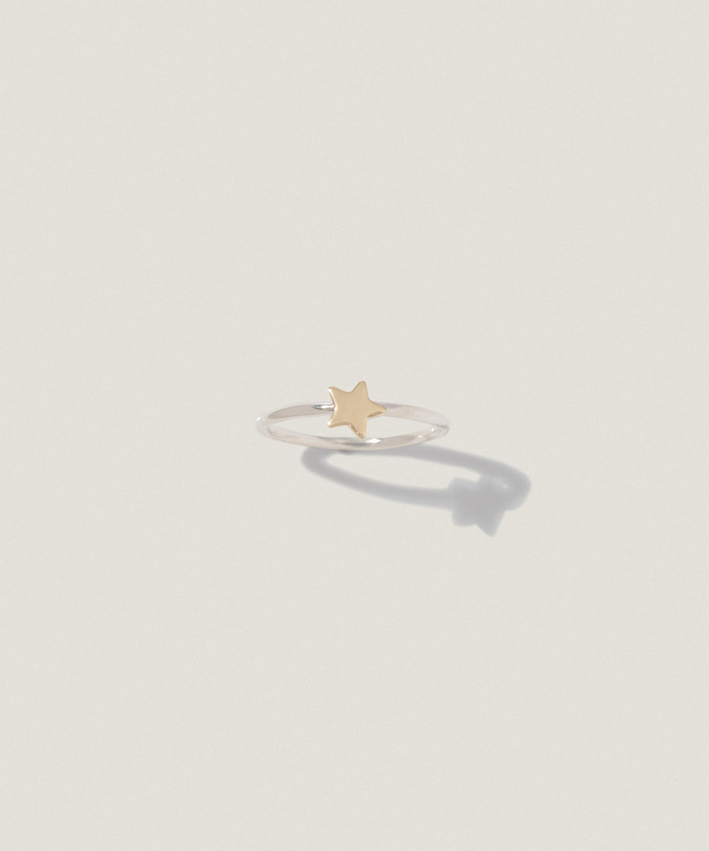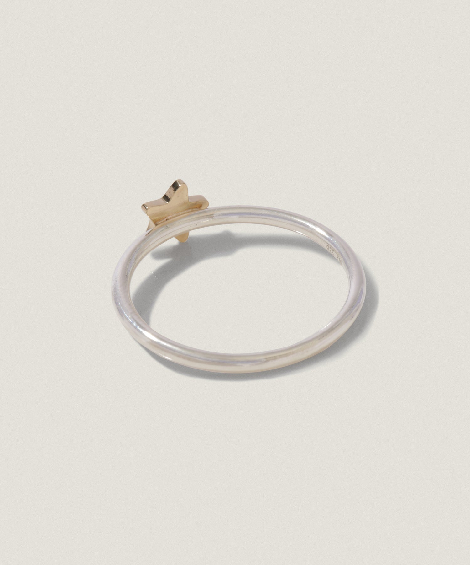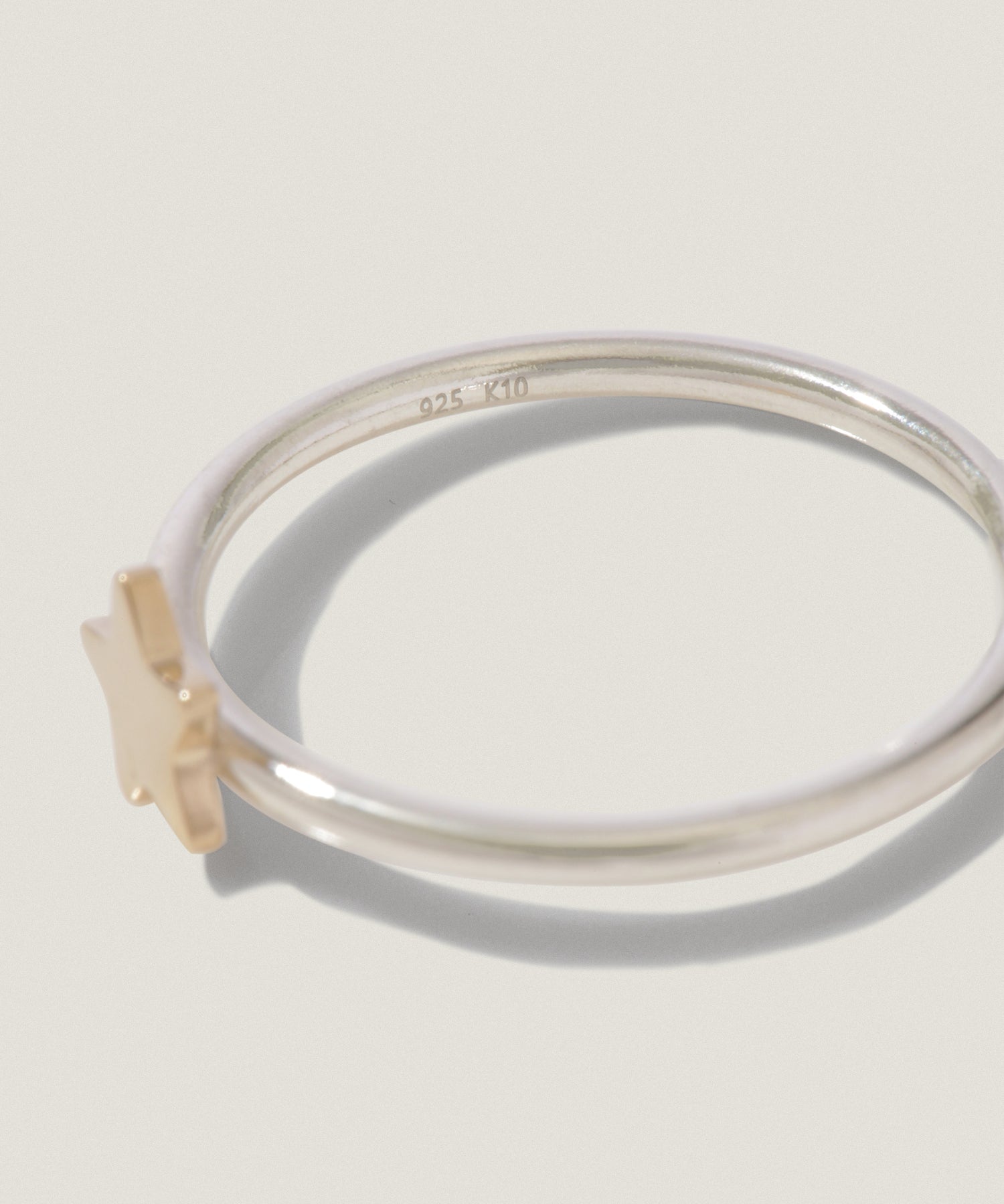星のモチーフは、あえてほんの少しだけ角度をつけて配置し、甘すぎない個性を添えました。リング自体も華奢すぎず、さりげなく存在感を放ちます。
