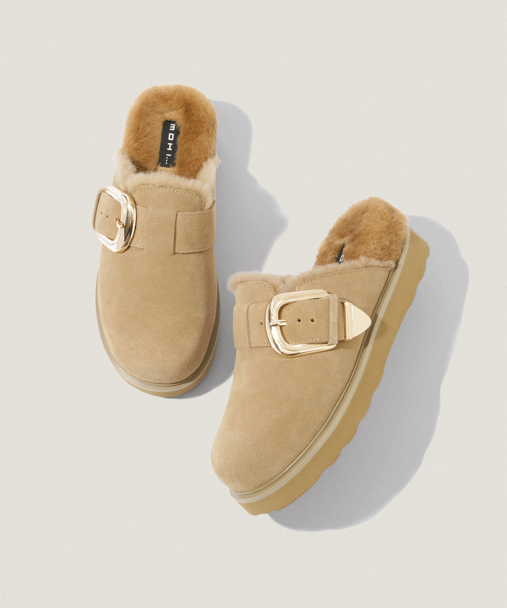 スペイン発〈MOHI〉のファーサンダルは、牛革スエード×ふかふかのファーで、シーズンの狭間にぴったりな一足。