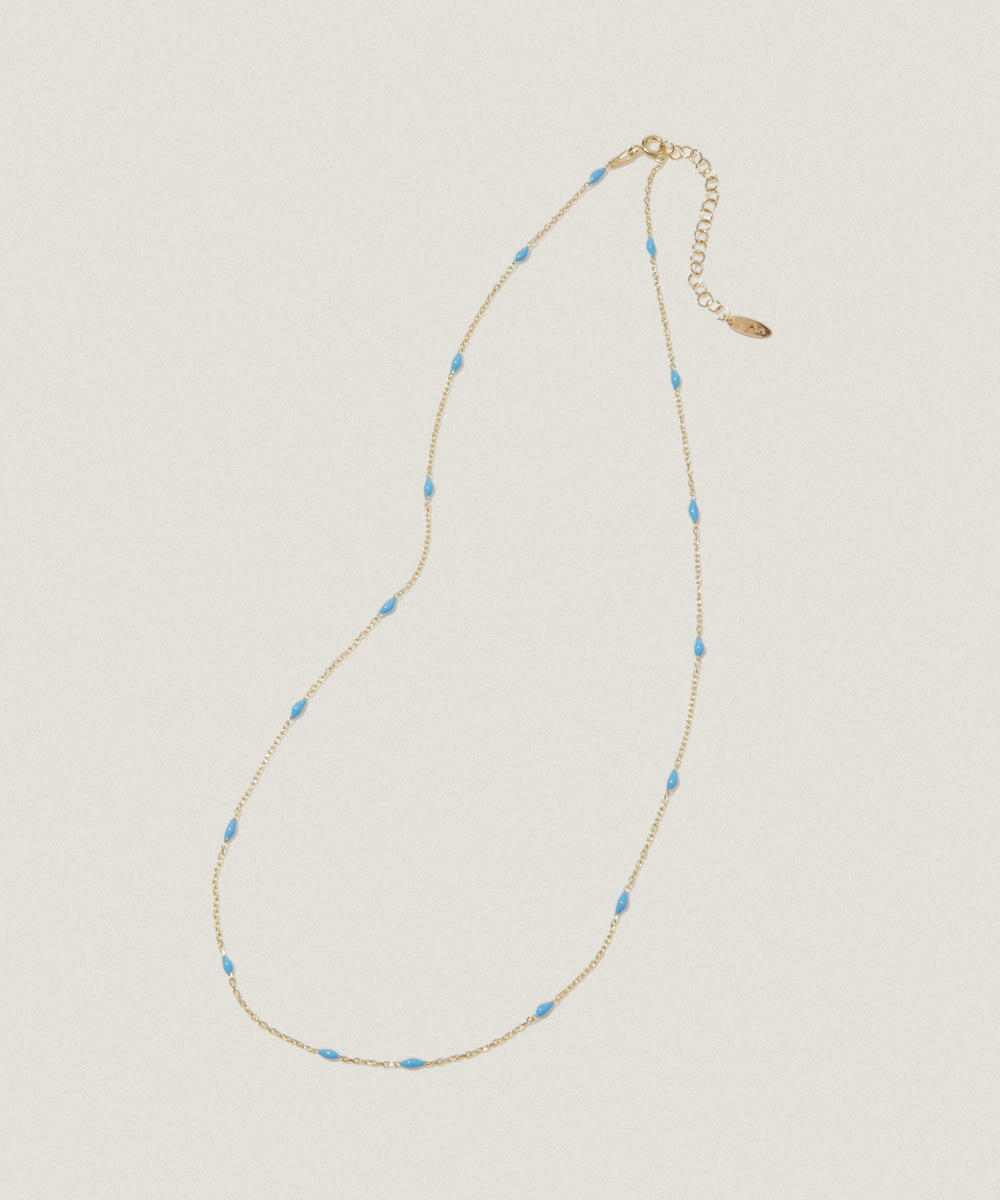 繊細なゴールドチェーンに、涼やかなターコイズブルーのカラービーズをあしらった、Maison Irem(メゾンアイレム)のサマーネックレス。