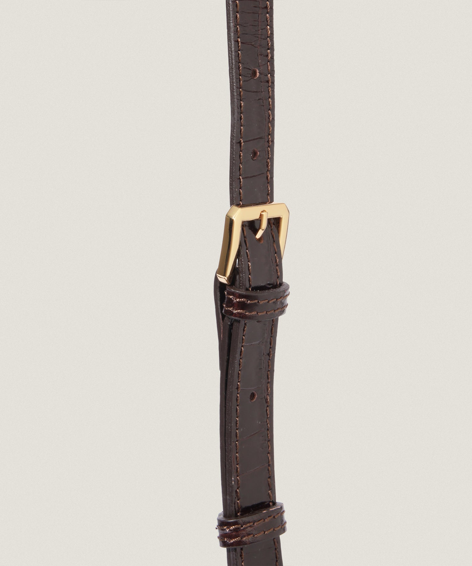 ビターチョコレートのように深みのあるダークブラウンに、クロコ型押しを施したクラシカルな仕上がりです。
