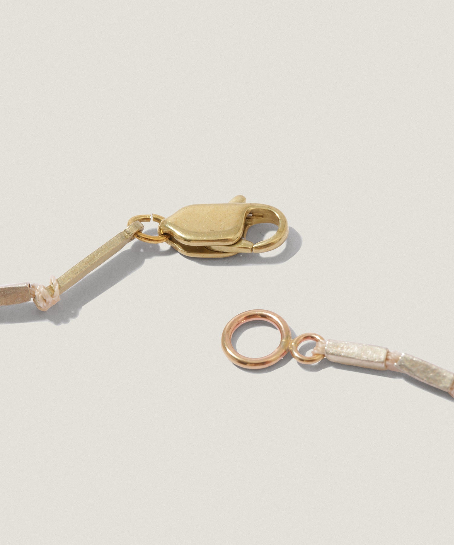 真鍮ビーズも、糸も、少し揺らぎがあるからこそ、手元に自然なリズムが生まれる気がしています。