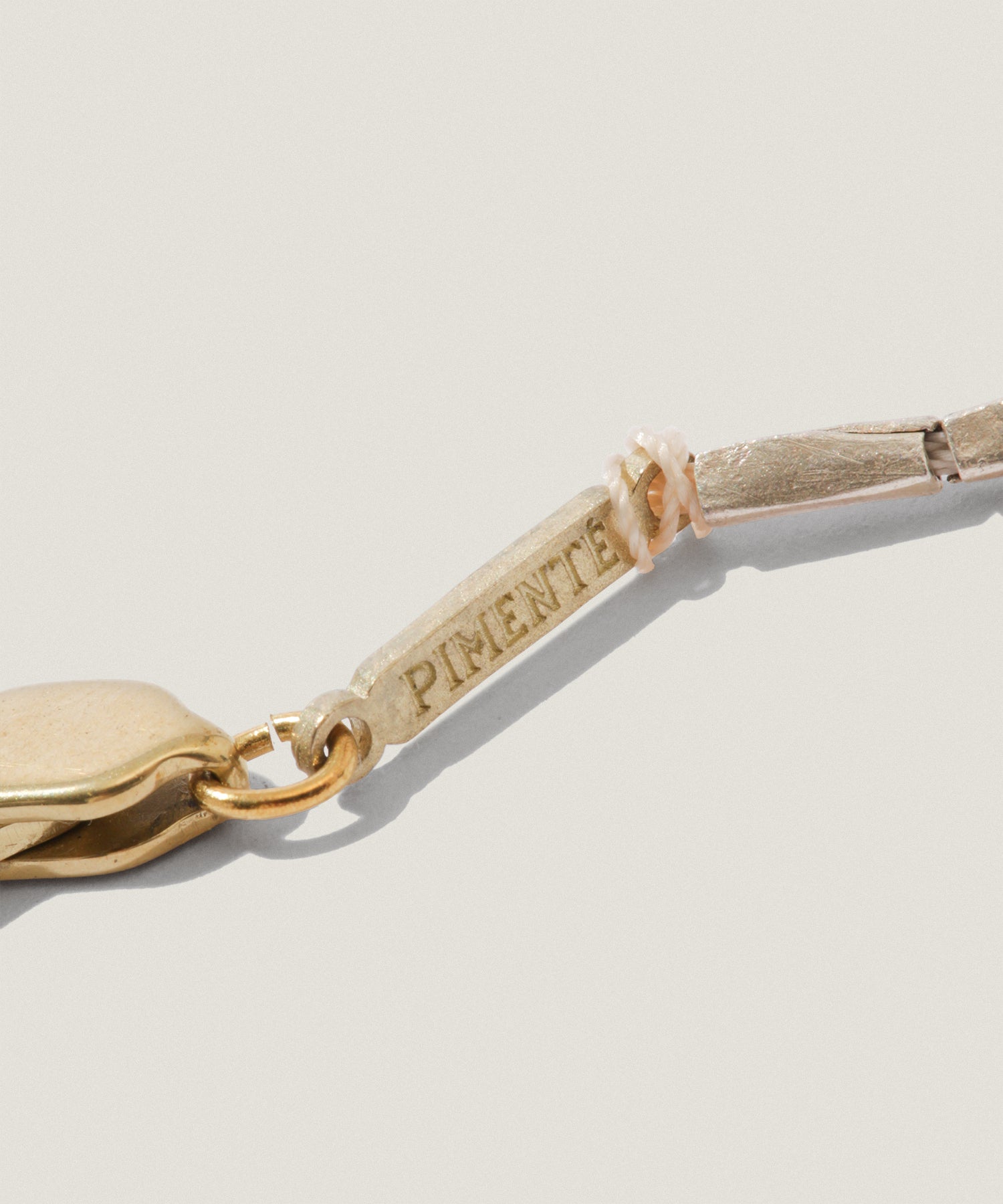 素朴な真鍮の風合いと、生成り糸のやわらかな表情が重なり、きちんとしすぎない、抜けのある存在感に。