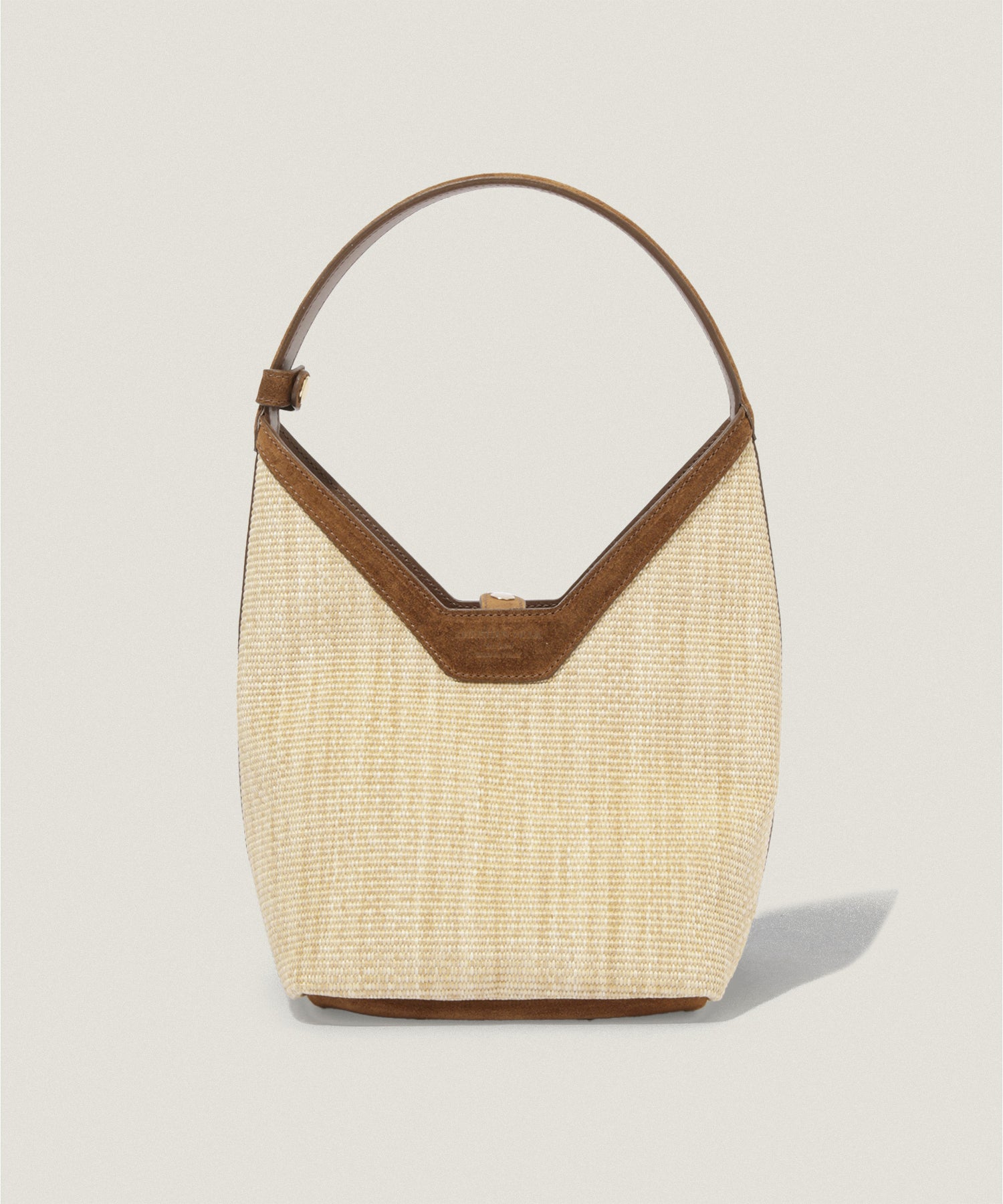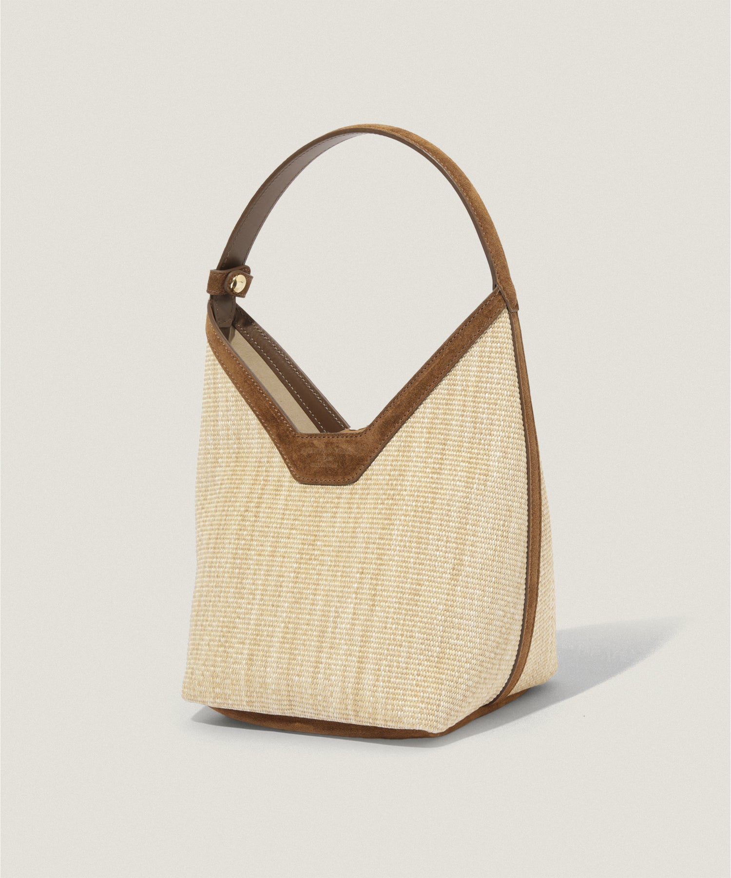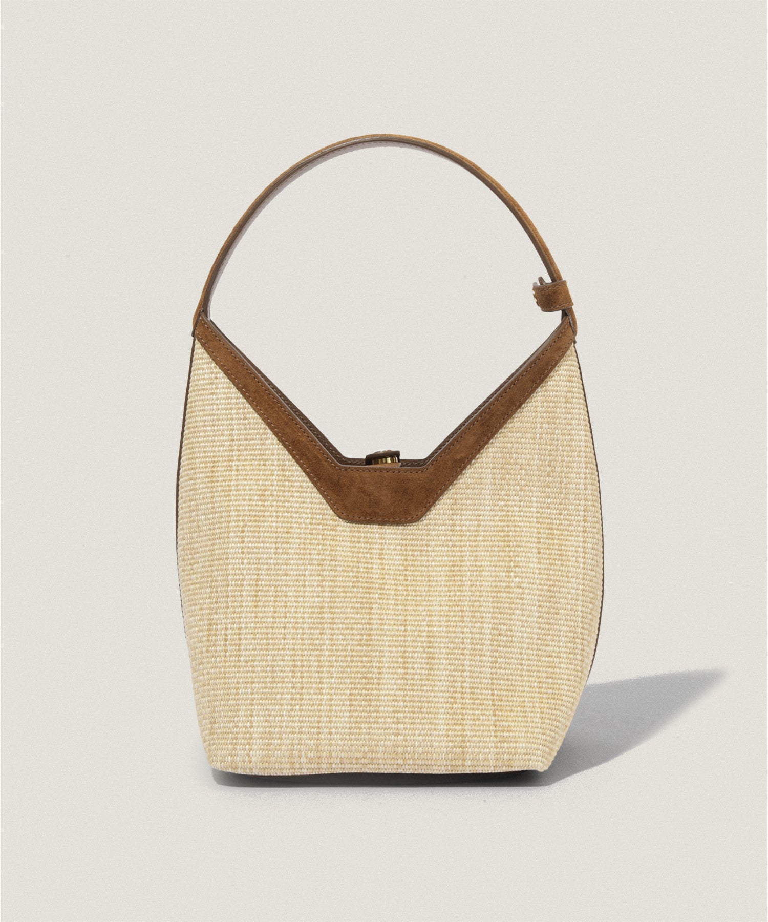 やさしいラフィアの色味をスエードで引き締められているので、カジュアルになり過ぎずに使えます。コンパクトに見えて、ペットボトルも入るサイズ感なので荷物多めの私にはありがたいです。取り外しができるポーチがついているのも大きなポイントです!