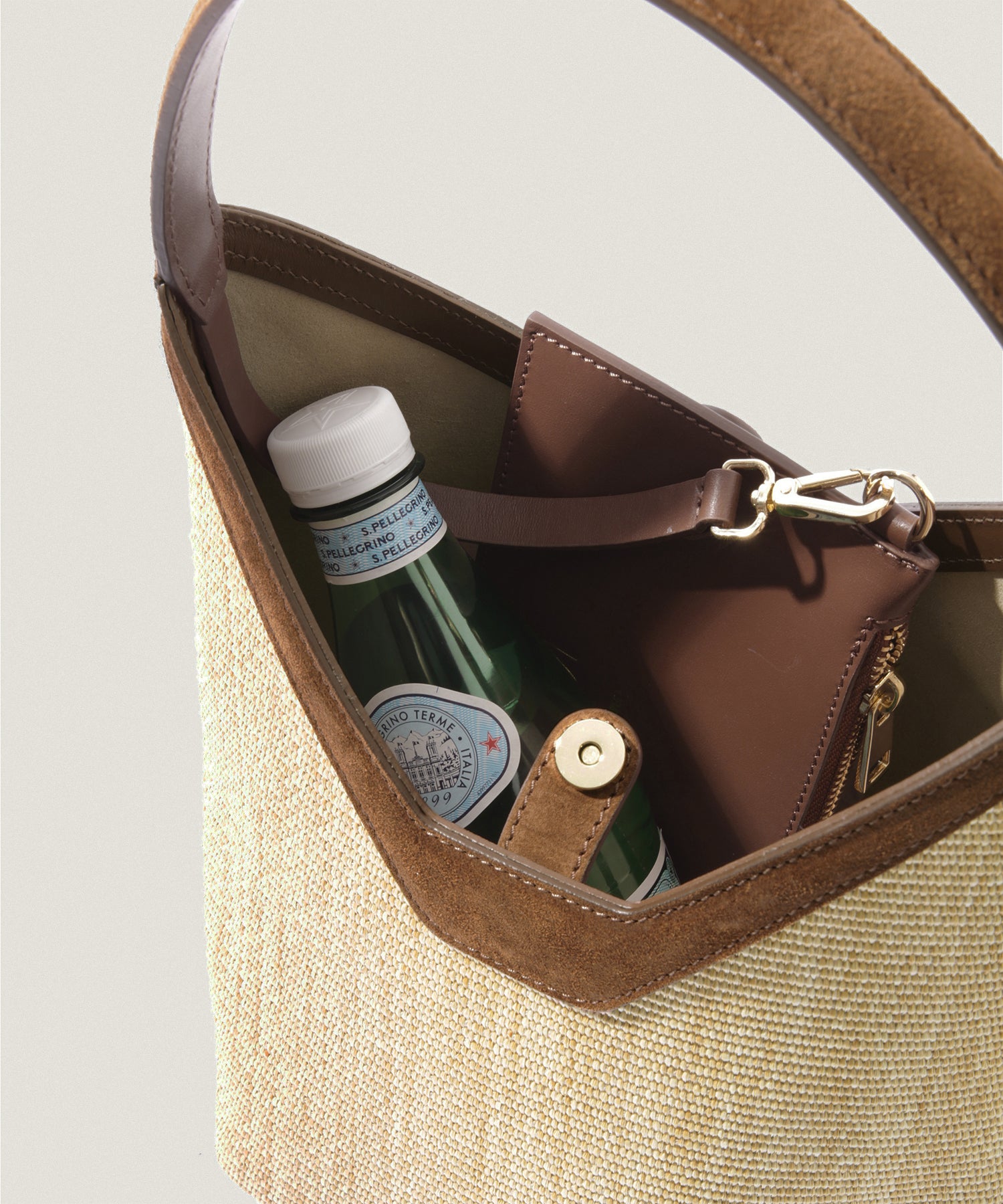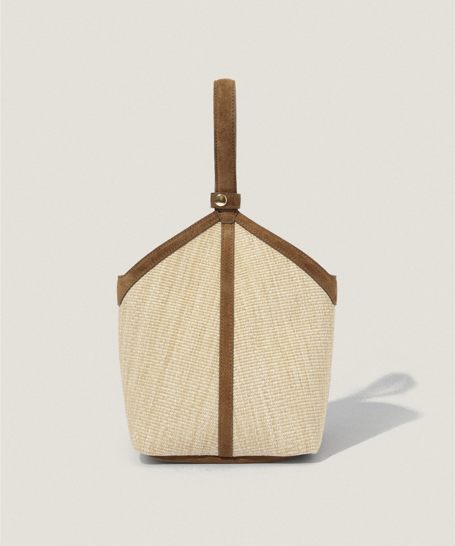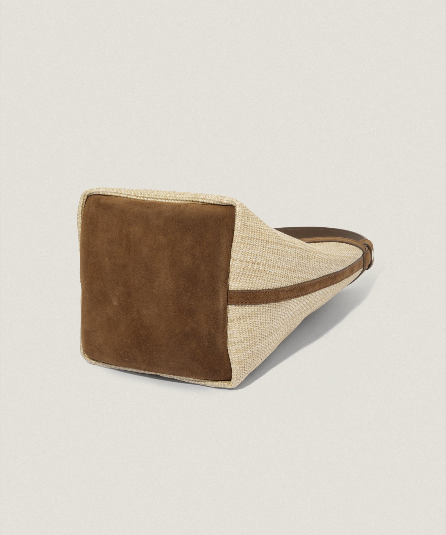 やさしいラフィアの色味をスエードで引き締められているので、カジュアルになり過ぎずに使えます。コンパクトに見えて、ペットボトルも入るサイズ感なので荷物多めの私にはありがたいです。取り外しができるポーチがついているのも大きなポイントです!