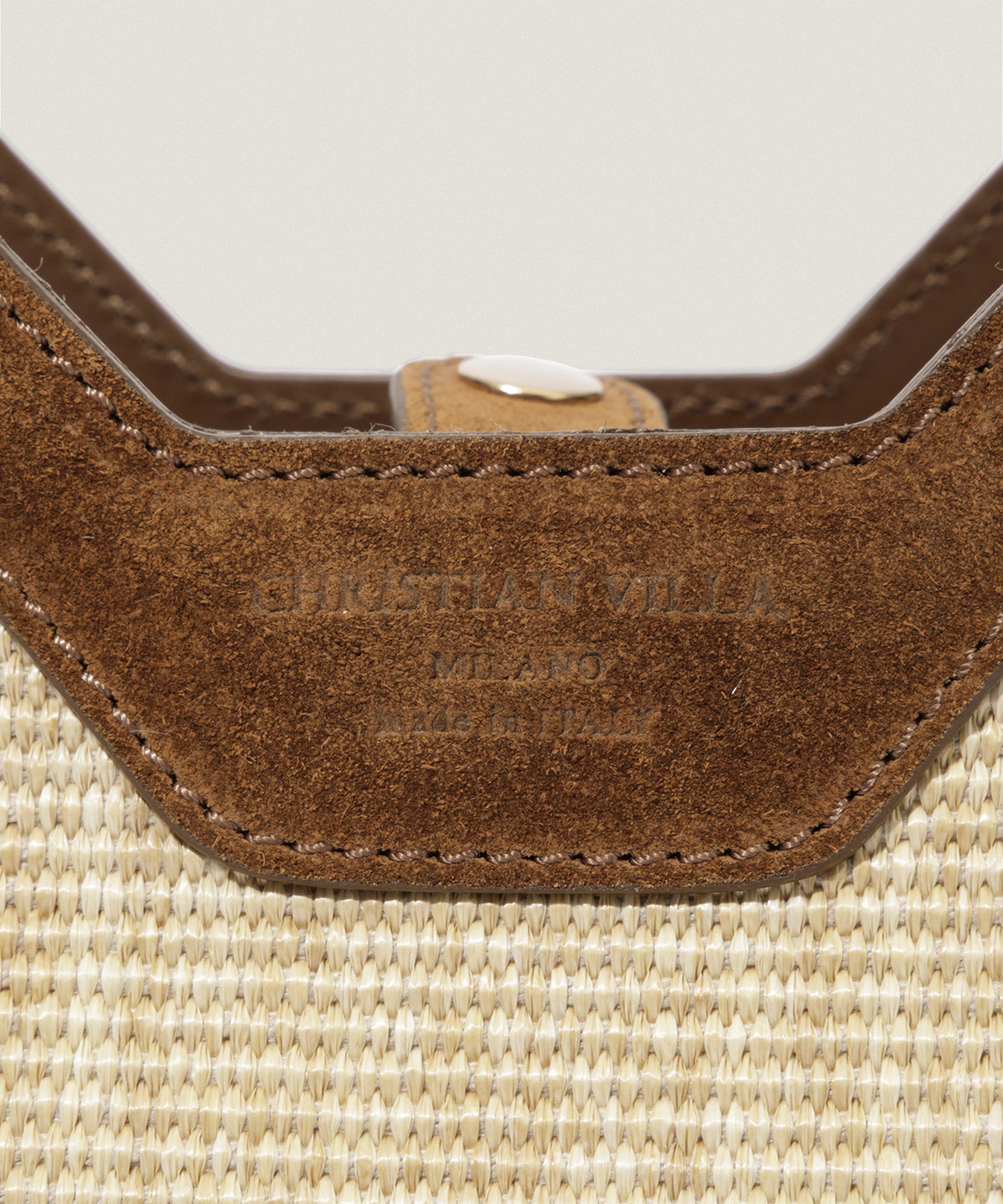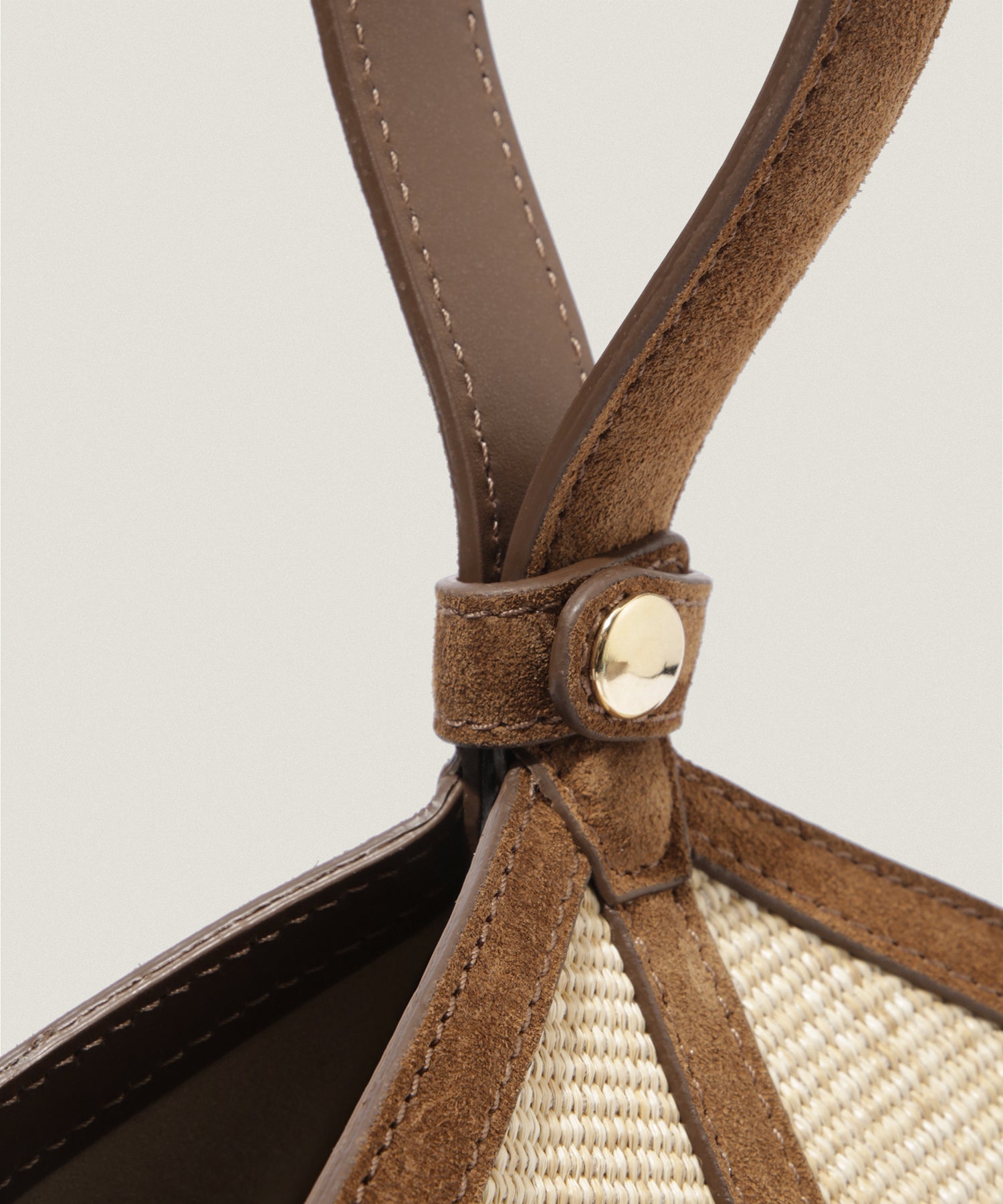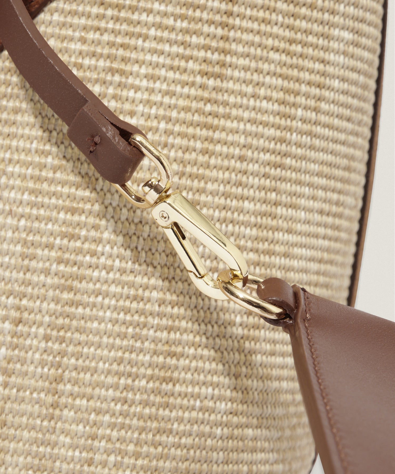 ナチュラルなラフィア素材に、レザーのトリミングを効かせることで、カジュアルになりすぎない上品な印象に仕上げています。
