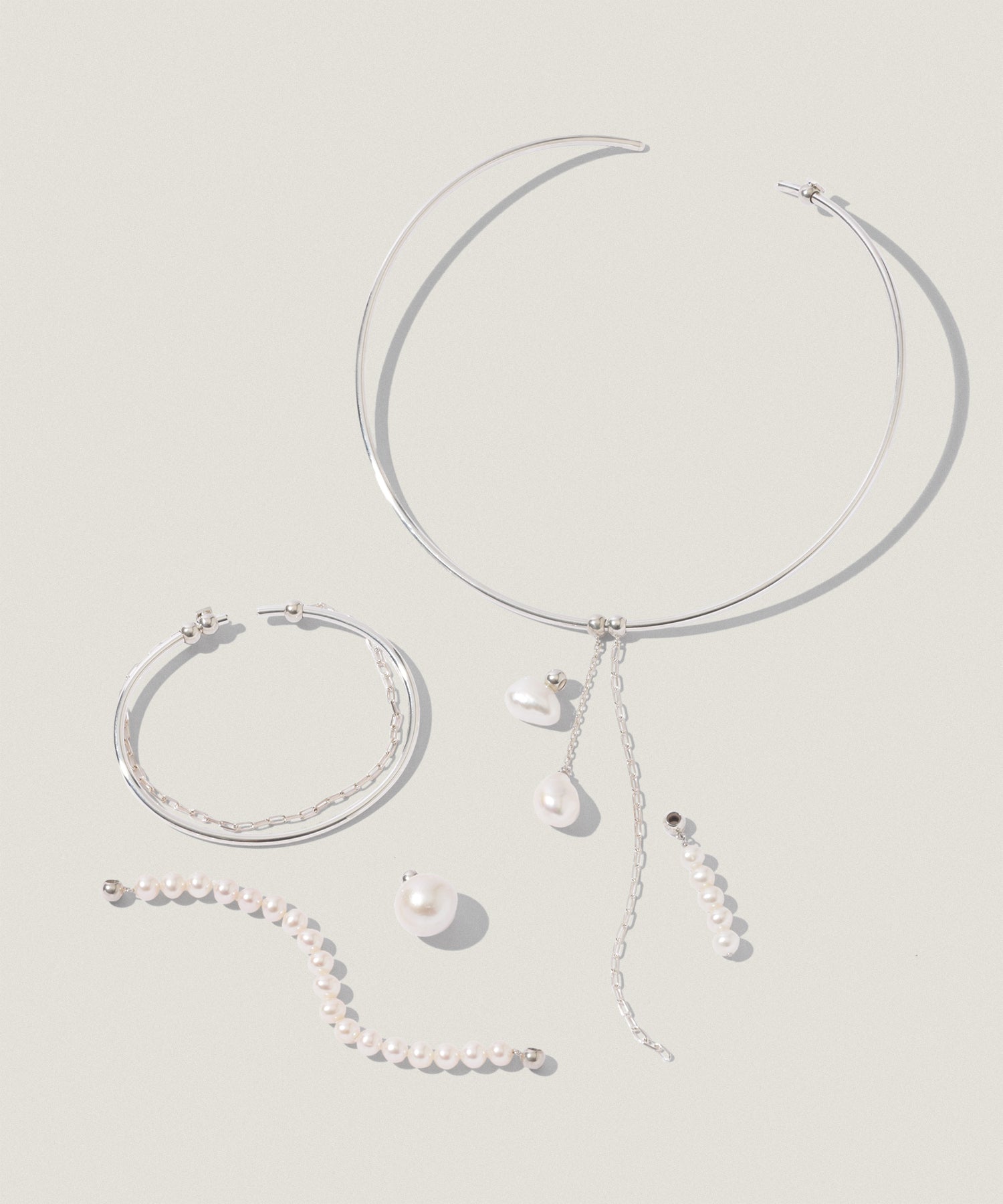 今回はチョーカーとバングルに、シルバーやパールのチャームを組み合わせ、「ホワイトコレクション」のようなイメージでまとめました。
