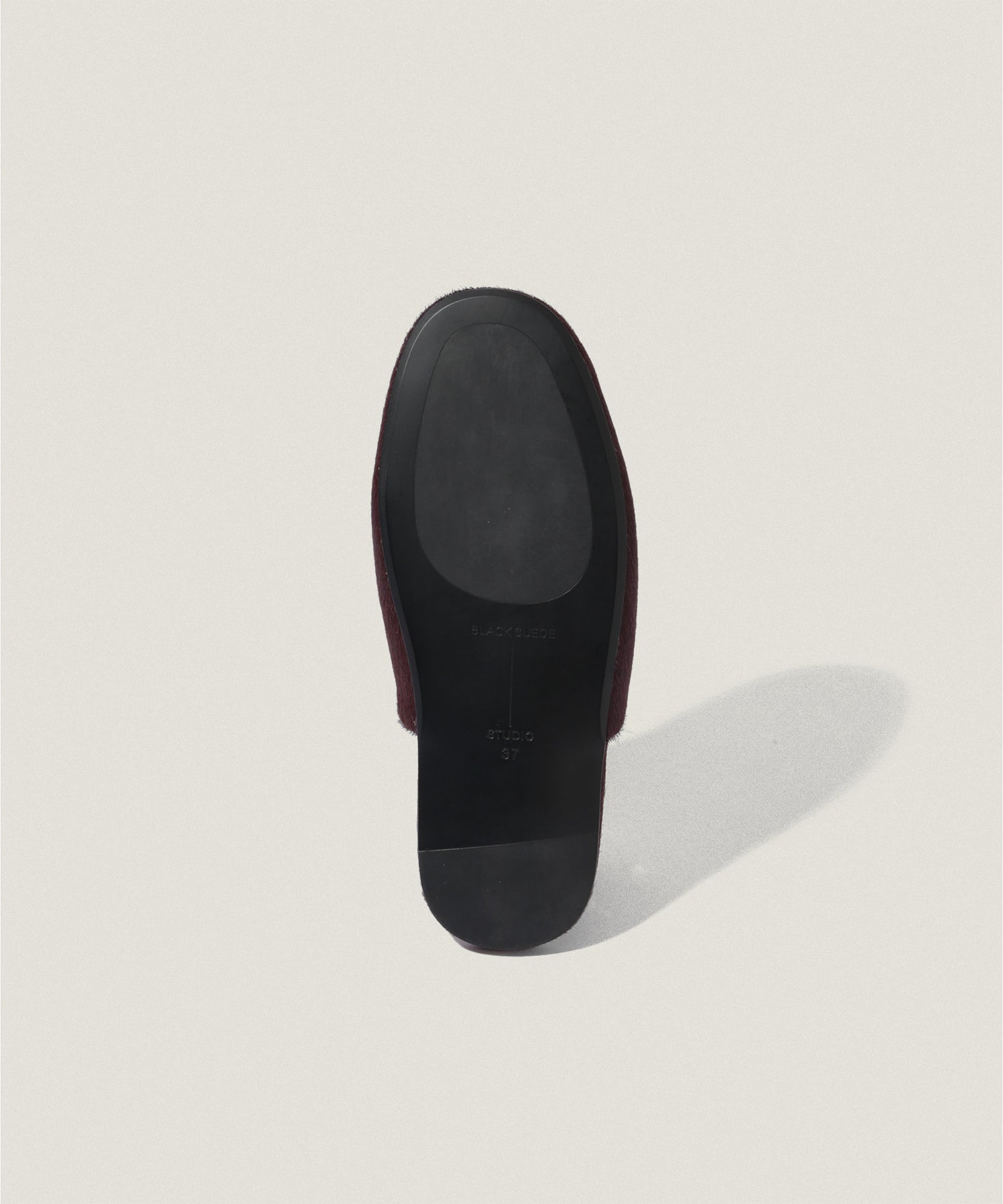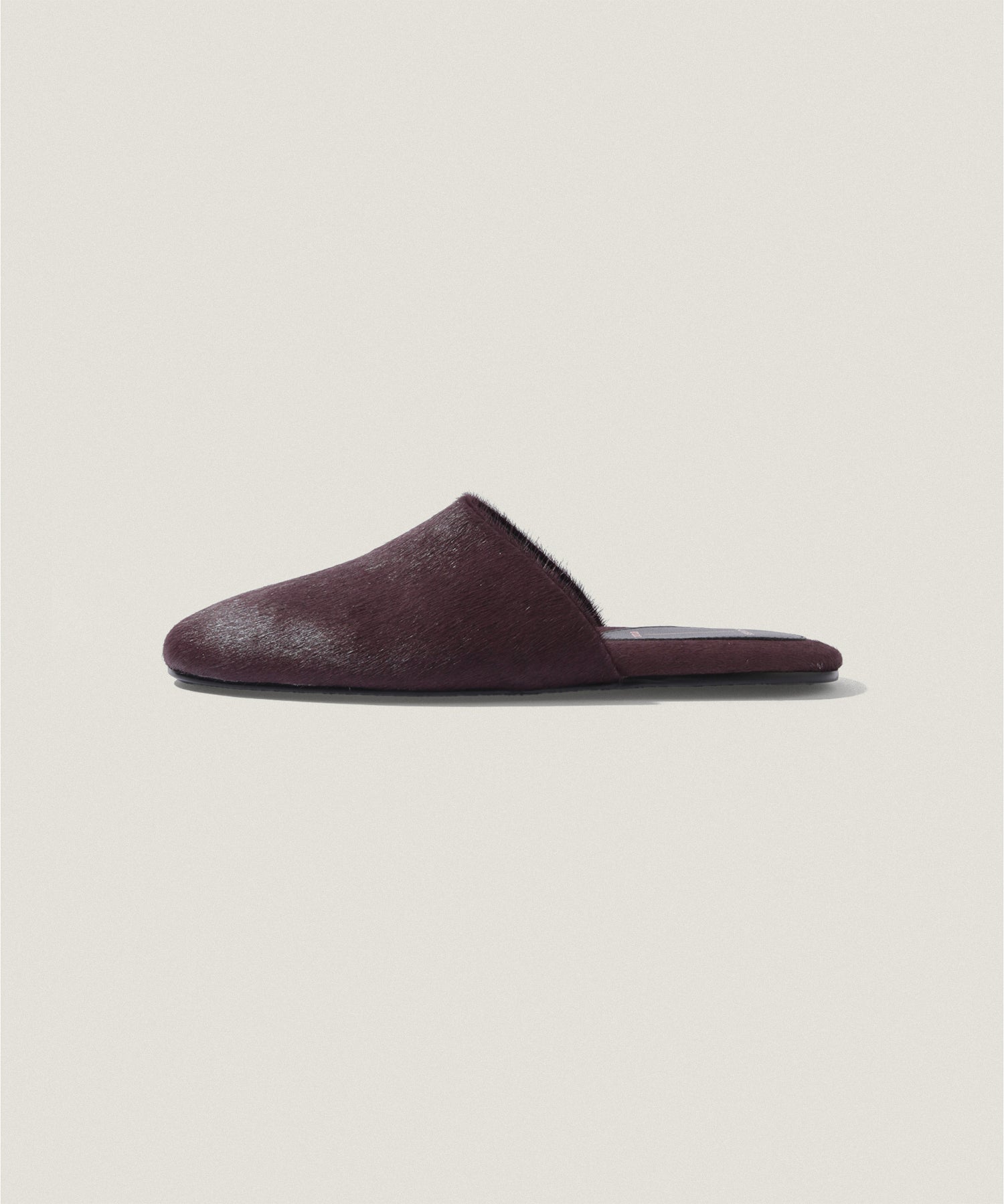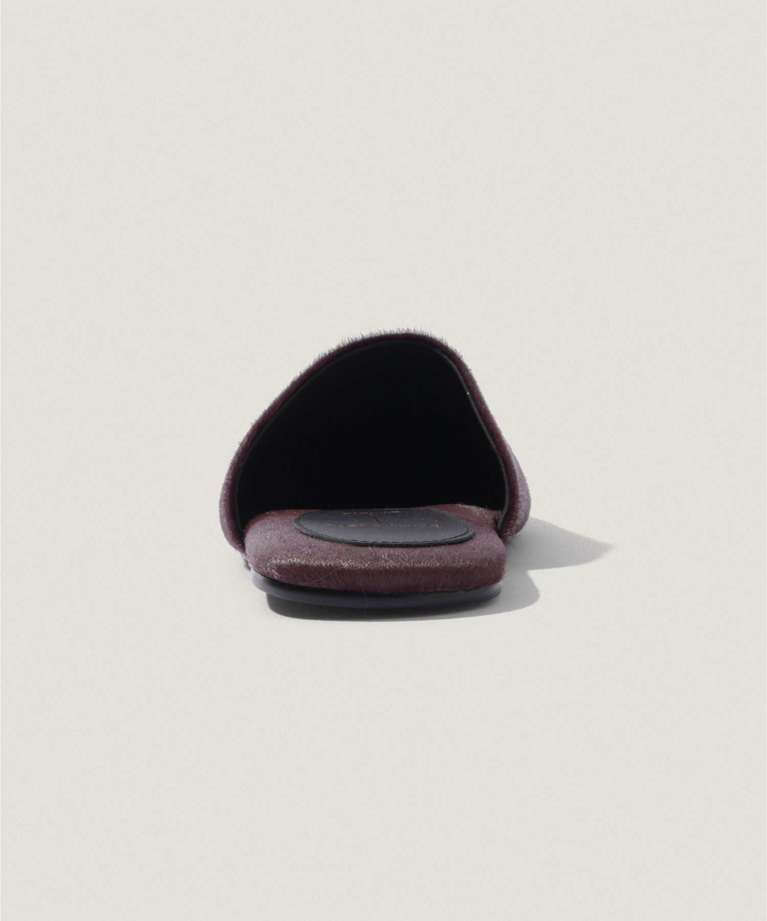毛足の短いハラコ素材を贅沢に使用した、ミニマルな美しさが際立つスリッパタイプのシューズです。